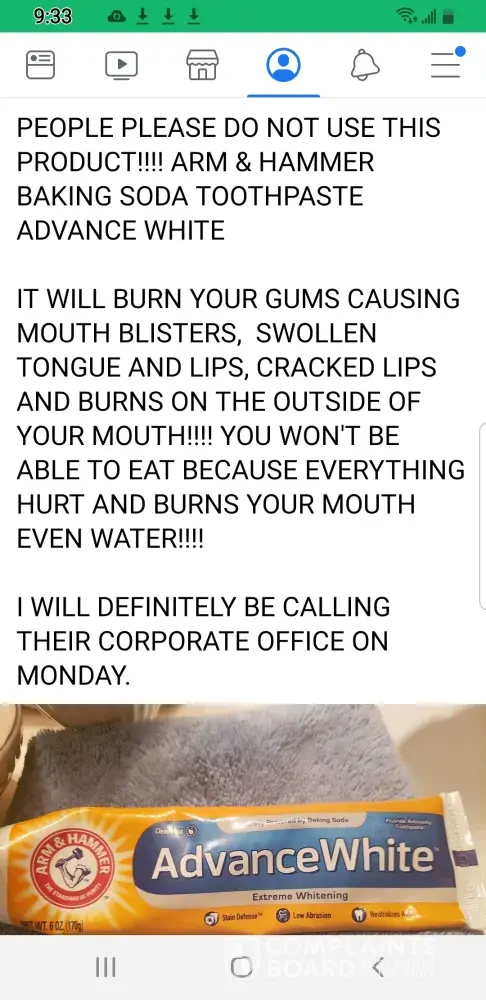Brushed my teeth this morning with arm and hammer toothpaste and the upper and lower walls of my mouth got burned. I couldn't even use my mouthwash as it was hurting so bad . I thought it was the toothbrush but it is not, it's the toothpaste. Will discontinue.