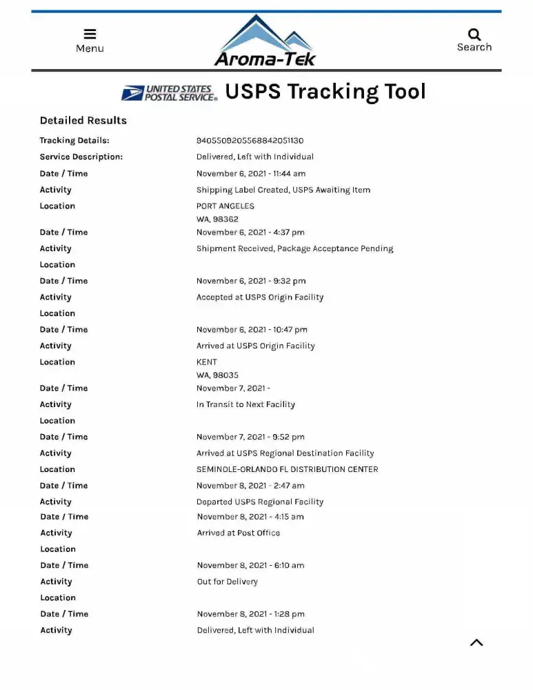 Alleged USPS form stating the product was "left with individual" on November 8. This is highly suspicious. No item was left; it was not delivered.