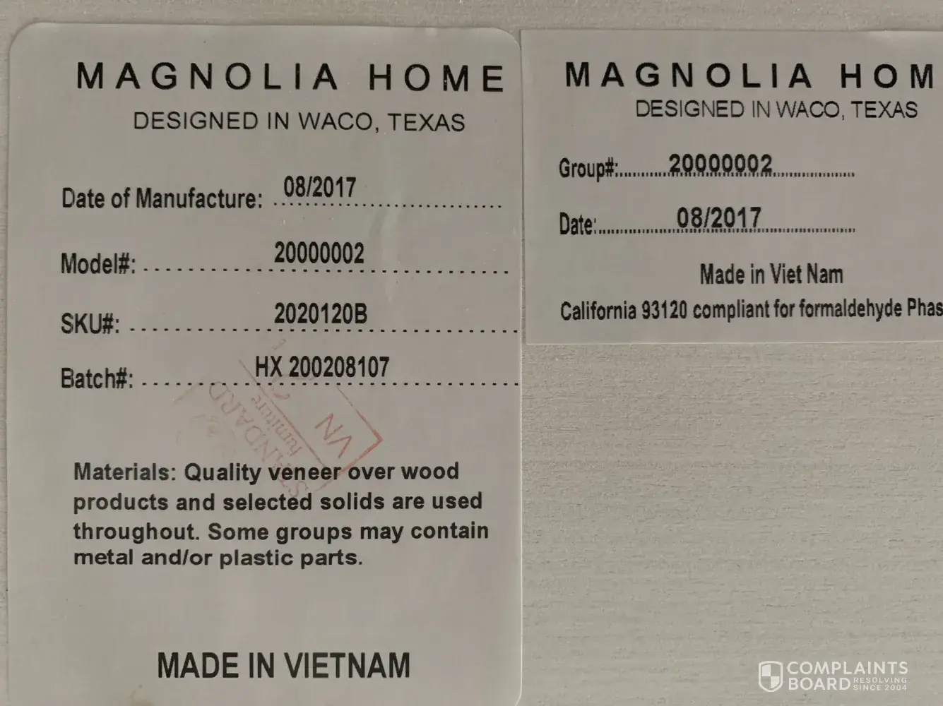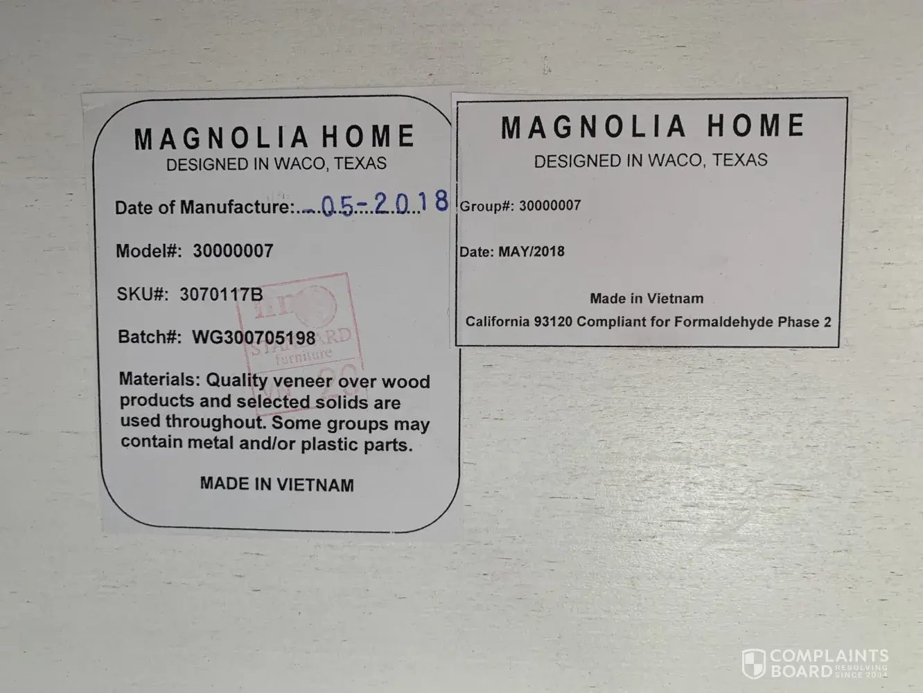 Late January 2019 I called my favorite salesperson at this location, (Georgette Johnson). I was interested in purchasing JoJo's Magnolia Large Table/Desk. After being told that there was a significant promotion at that time, I called back and ordered the matching Petite Rosette Table and the nightstand. After Georgette had gathered the pricing and called me back with this Information, she stated that apparently the sale was for "office furniture only". This excluded the two additional tables that I ordered. I placed the order regardless and added the desk chair. A few days later I was notified that the nightstand and chair were no longer available even though their system showed otherwise. So I settled on the 2 pieces rather than the 4. Deposits were provided. A week or more later, I was notified that Magnolia was transitioning their furniture build site from Vietnam to the USA. I was told by Rachel that this would cause an approximate 3-4mos delay. She added that I would be receiving nicer furniture in the end which to me, felt worth the wait. My furniture came in, (another long story), and due to our son getting married in June, we delayed opening the items to be assembled. Once we got around to inspecting the furniture, low and behold, there was a stamped label on the bottom of each piece that stated "MADE IN VIETNAM". One stated 2017 and one 2018? What in the world happened? The manager certainly did not care when I called him. He sent me a $25 gift certificate. Not a great compromise for being lied to. The furniture is flawed as well. Scratches, caulk added, yellow rings on certain areas, etc. I want a refund, NOT A REPAIRMAN VISIT!