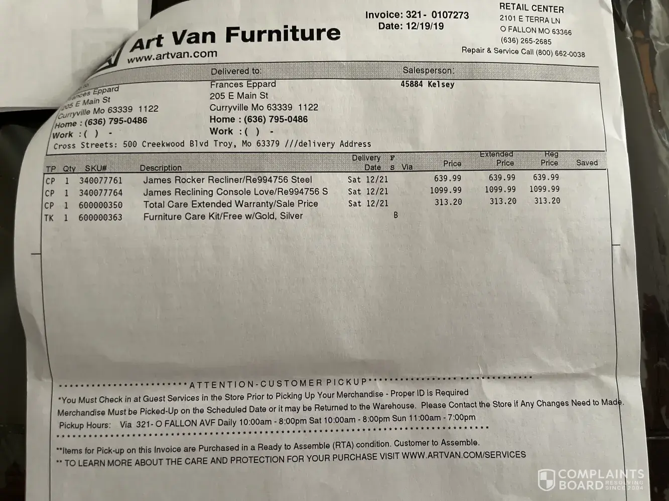 I bought furniture from art Van with a warranty on it stating that anything goes wrong with the furniture that I didn't cause it would be fixed so I called the claim number they gave me a claim number we my wife told them what was wrong and then they told me or my wife that they couldn't fix what was wrong with my furniture so why did they give me a warranty that I paid for if they couldn't fix it