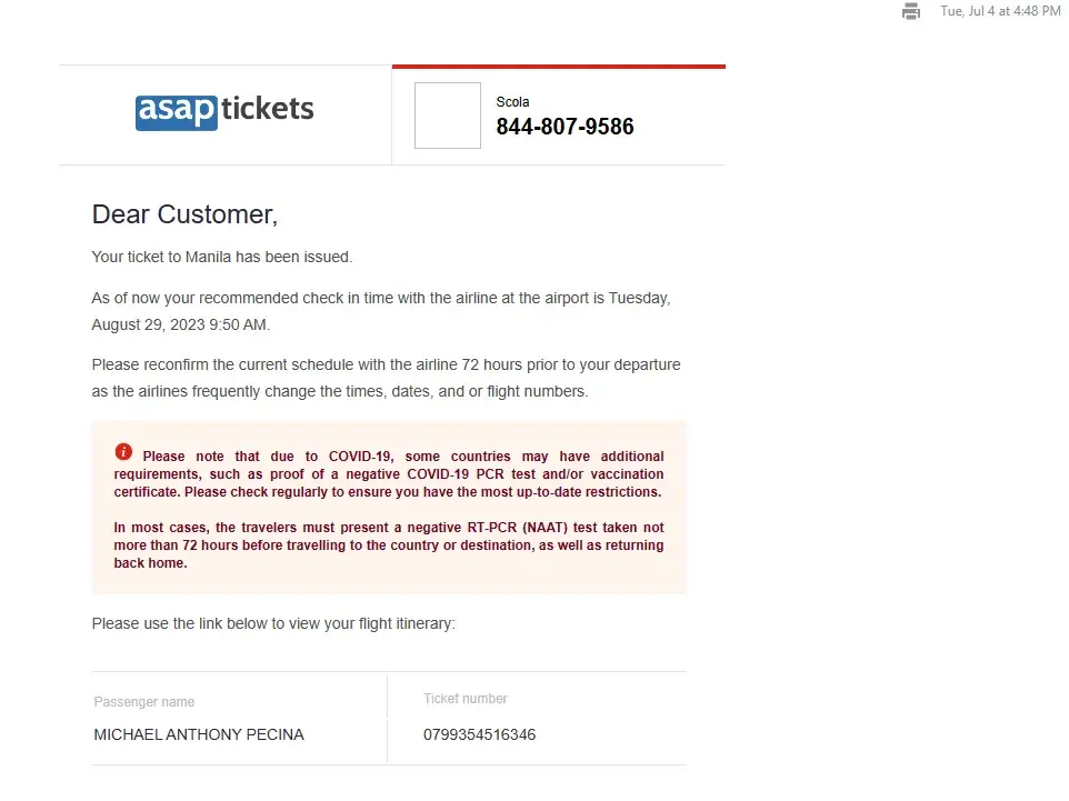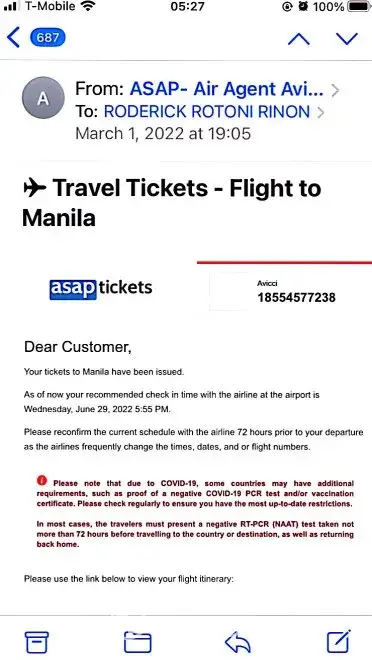 When I started my search through ASAP Tickets, I was very specific about my requirements. I had clearly mentioned the date/time (18th June morning) and luggage (2 baggage per passenger for check in) which is important for me. I contacted Mr. Arnav (arnav. [protected]@asaptickets.com) on 21st Feb 2022 and he has confirmed that both requirements are meeting the criteria with airlines he suggested. I made the booking on 22nd Feb through Arnav. I had also paid extra protection (ITN Travel Care Services) $479.80 for this so that I would be covered with all the requirements that I was looking for.