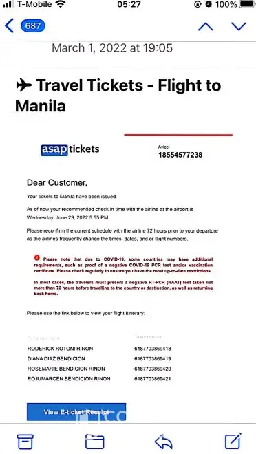 On 3/21/22 AsapTickets emailed Travel Care Services confirmation no. 2814505 (attached)