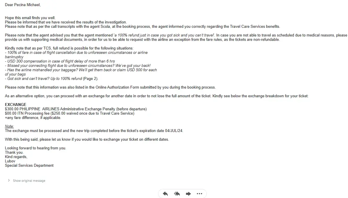 On 3/24/22 American Express notified me that my dispute D-[protected] is closed. AsapTickets ITN sent AE a copy of Travel Care Services details (attached) that I have never seen before.