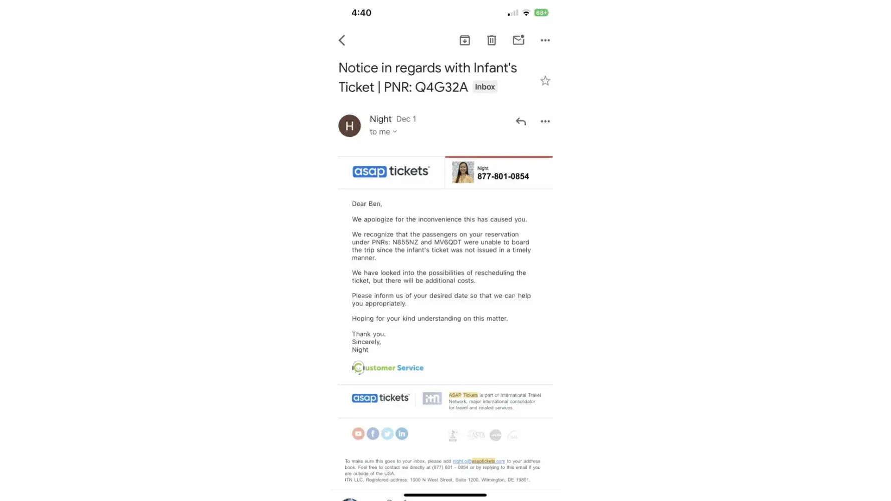 I booked a flight for two passengers and I then added and paid for an infant to on November 30, so that he can travel with his mother on a December 1, 2023 flight from Addis Ababa to Dublin. Charmaine Nyoni and two children including the infant whom I had added and paid for arrived at the airport for check in. They were advised that the infant was not booked and didn't have a ticket. at the same time, I received an email from ASAP stating that they were working on getting the ticket for the infant as soon as possible. Charmaine waited for ASAP to issue the ticket and this never happened. we made a lot of calls to ASAP but with no success of solving the problem. Charmaine Nyoni couldn't travel and leave the infant behind. as a result she was forced go to the hotel.. to make it worse, she was visiting Ethiopia as a tourist. ASAP then wanted us to pay for the no show fee and other related fees. I declined, then they promised that investigation will take 3 to 5 business days. we waited and the given time frame lapsed. we were forced to pay $400 and we were promised that ASAP was still looking into. we had to pay for hotel, and subsequently, she overstayed due to ASAP negligence. three passengers had to pay.
