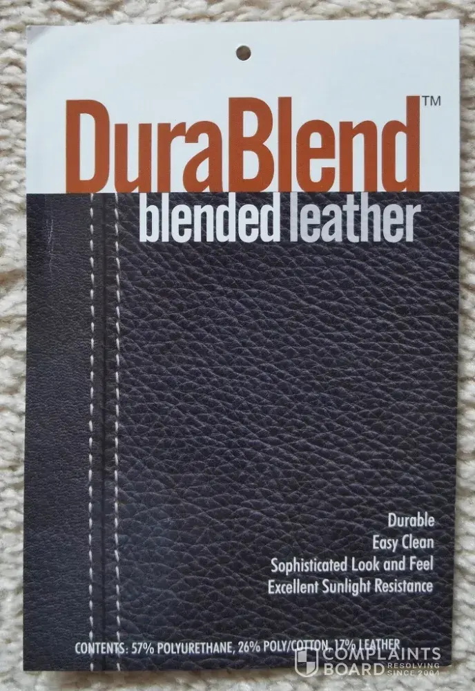 On the DuraBlend information card the first descriptive word is - durable! That word should have a question mark following it. (Durable?)... Another descriptive phrase on the card is"sophisticated look and feel."Please see the photos. Does that say sophistication? It should say -"Belongs in dumpster."Sophistication? I am embarrassed to invite people into my home. When I do, they always leave with pieces of the sofa and loveseat attached to their clothing. A souvenir of"sophistication."