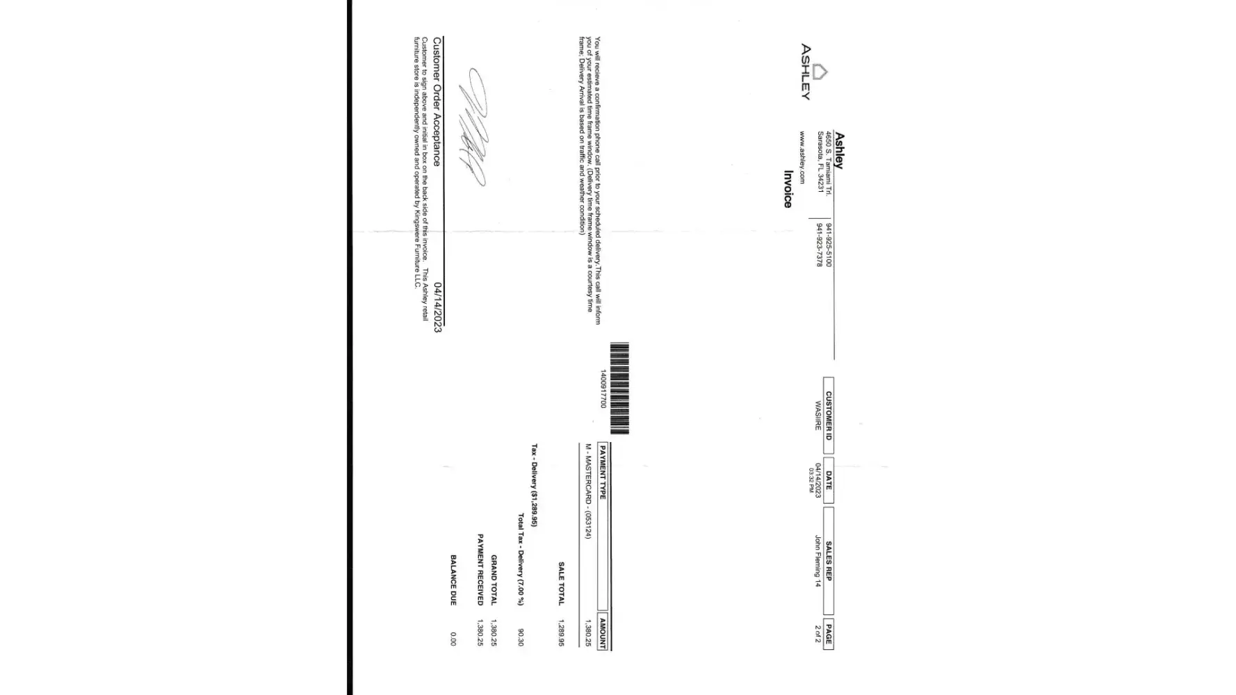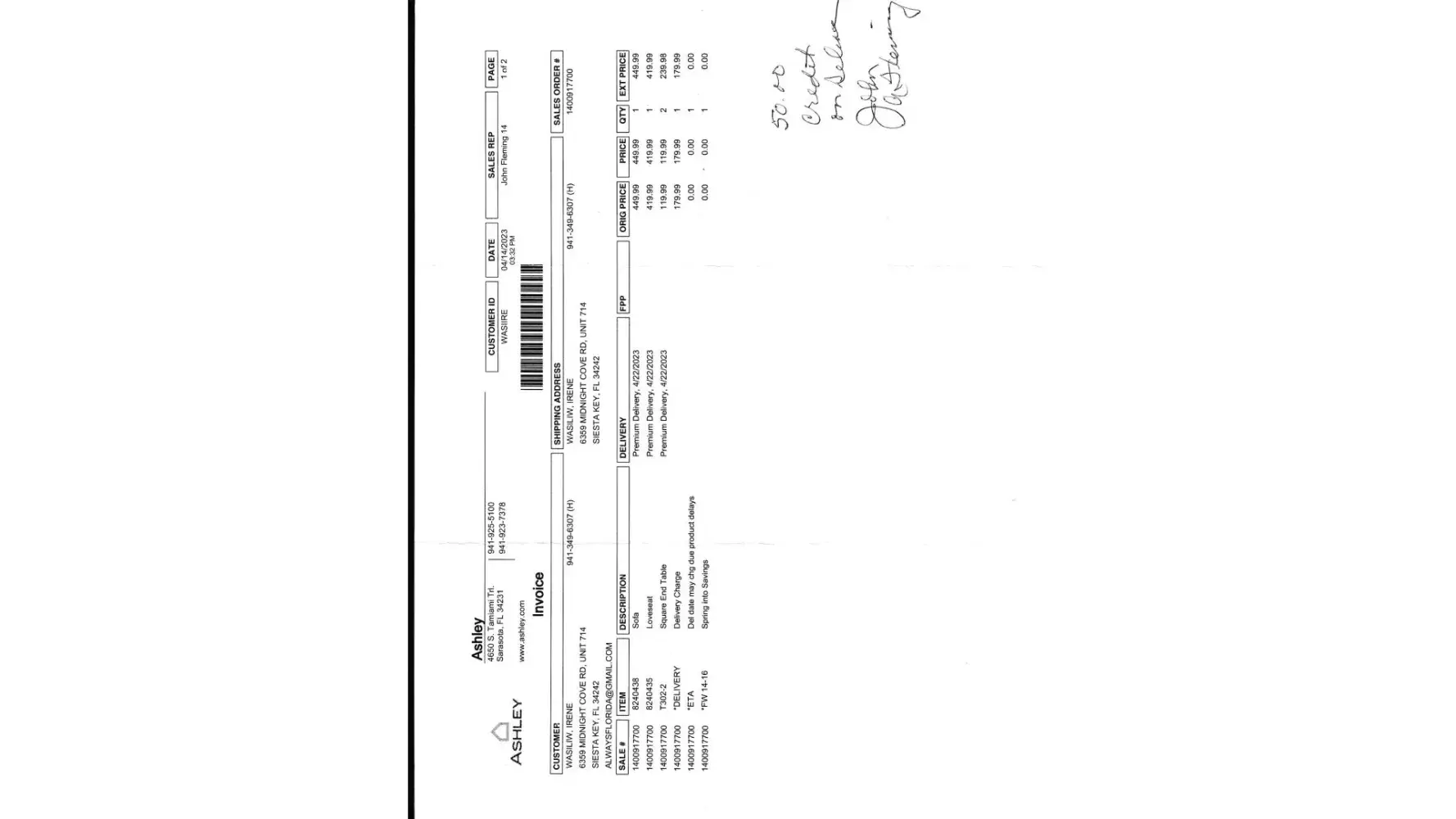 On April 14, 2023 I purchased some furniture from Ashley on sales order [protected], a sofa, a loveseat and 2 square end tables, a total of $1,380.25 and John Fleming was the trusted advisor. As per attached Ashley invoice, John Fleming indicated under signature that a $50.00 delivery credit plus tax would be processed, and he said that he would do it...
