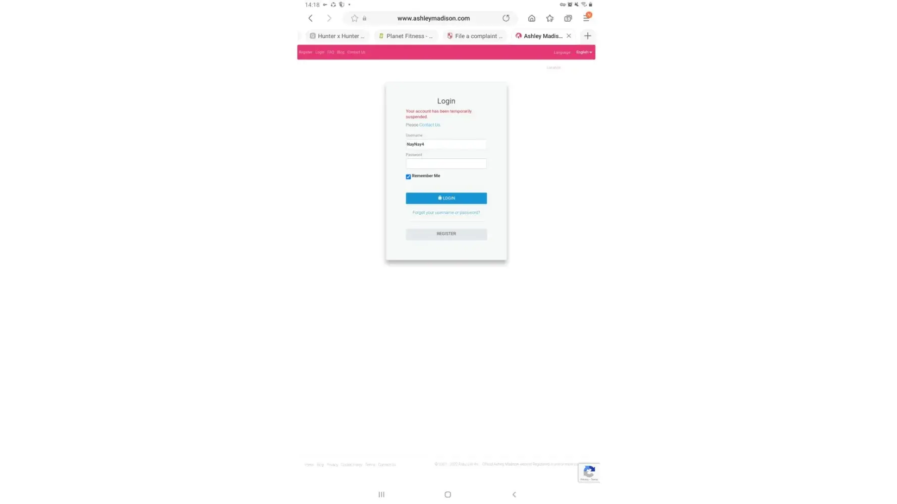 I am a real female in contact with men on Ashley Madison. I have only been on a few days. I have scheduled my first meeting but last night when I tried to get on it kept saying oops something went wrong and then please select recaptcha so we know you are a real person but there was something wrong with the login screen. So I contacted support. The only other thing that happened is that I called a guy out for using a photo of Tom Selleck as his own. So he might have reported me. Anyway today I go to log in and it says that my account has been temporarily suspended.