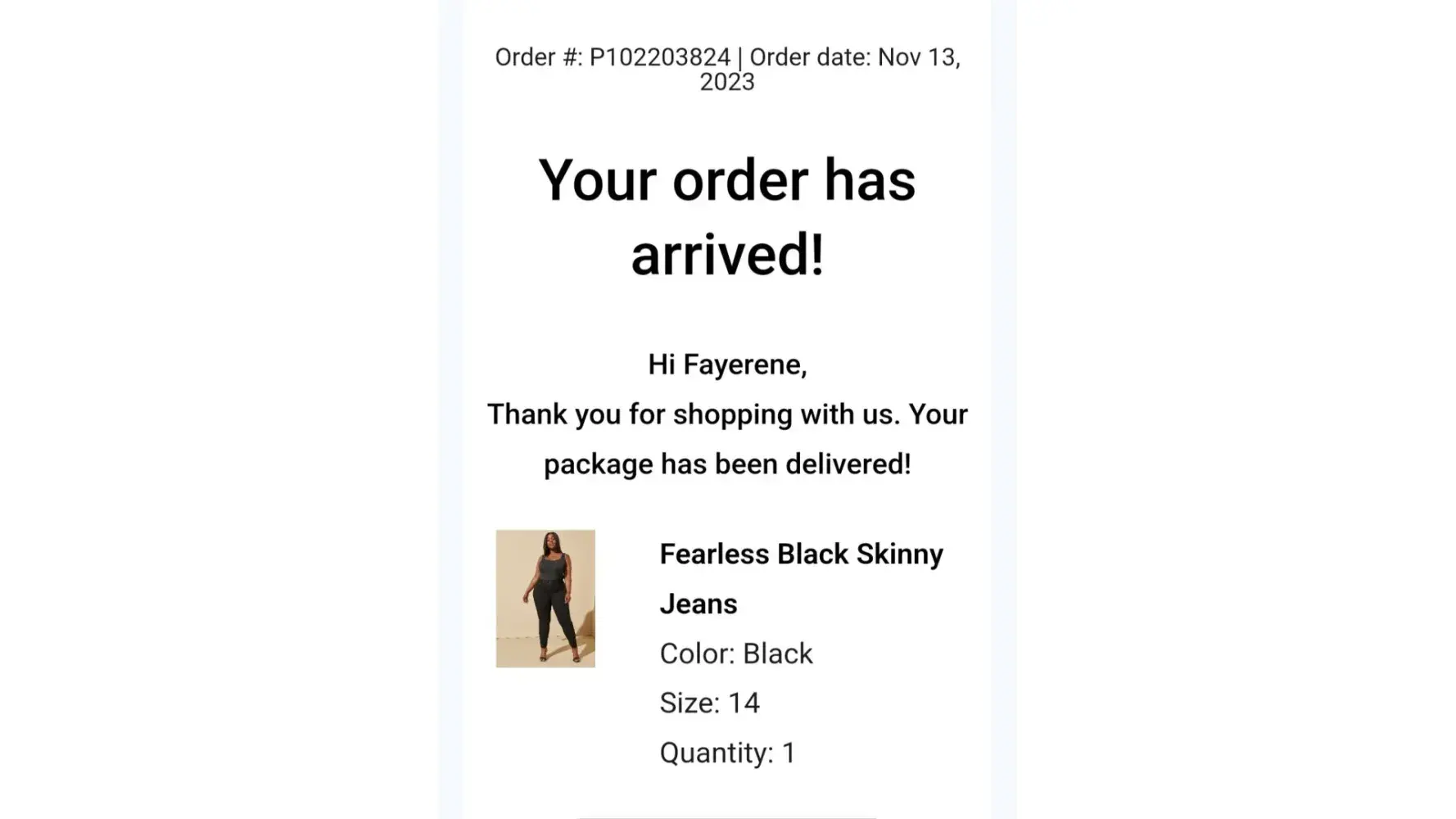 I placed an online order P102203824on 11/12/23, which consisted of three items. Those items were delivered via UPS on Friday, 11/24/23 @ 12:34 p.M. After careful examination of one of the items (black skinny jeans), it was then that I started a return. I also was told after calling the nearest Ashley Stewart store near me that I could return the one item...