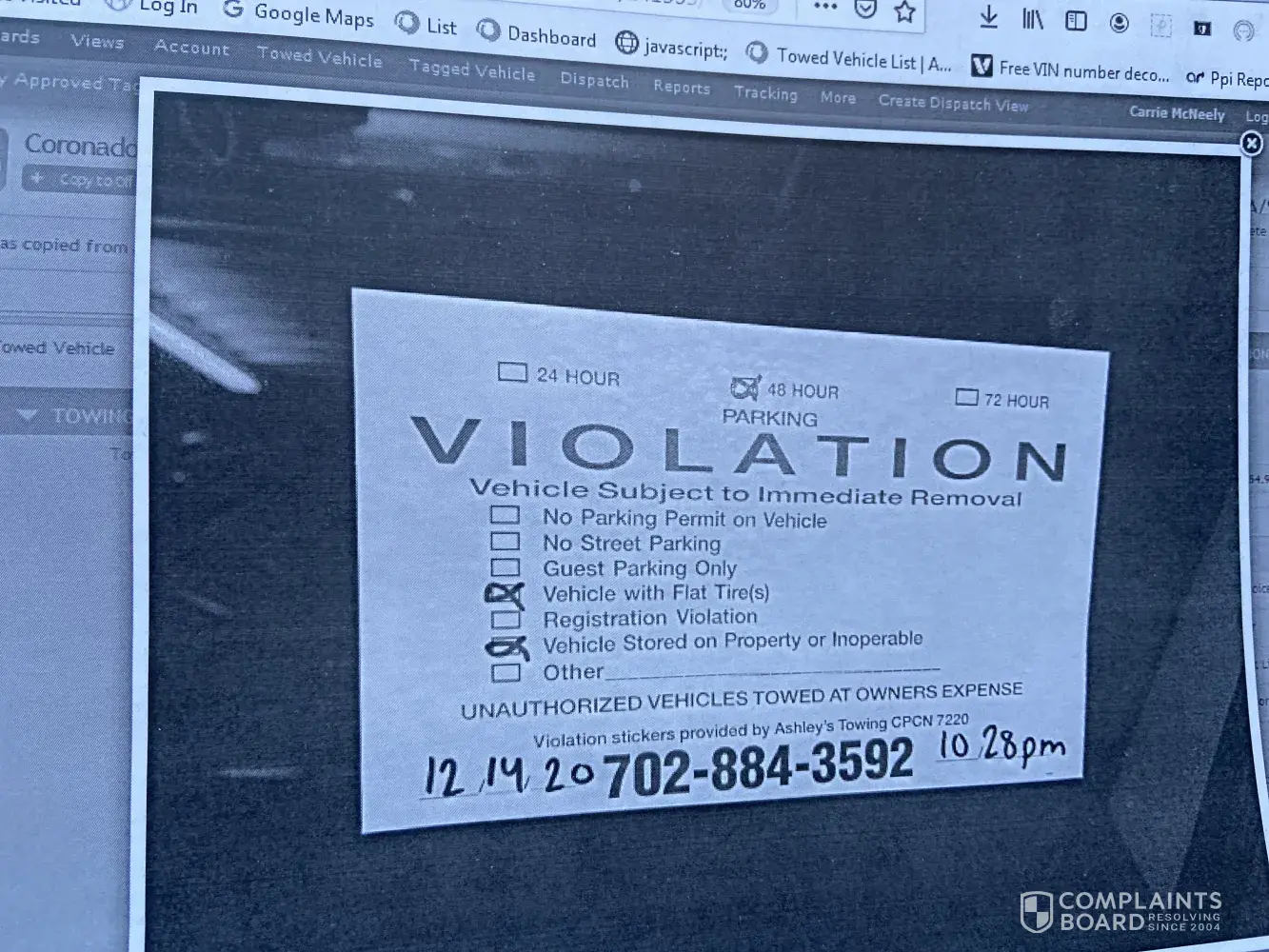 I live in southwest Las Vegas apartment community called Coronado bay club 7600 s Jones blvd. As per apartment lease policy a vehicle can be parked as long as it has valid registration and is operable. Ashley towed my vehicle only because it had a flat tyre and is on operational "ha ha ha" and charged me $220. Just because I had a flat tyre and in the...