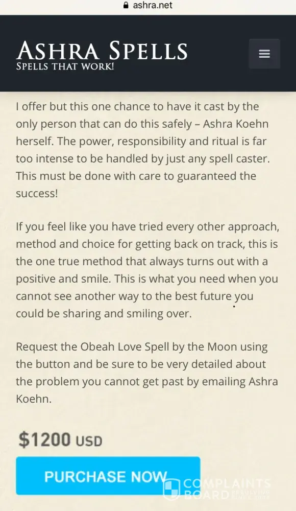 Before you order her spells read this! ashra is a fake spell caster that has been operating under a false name you can find several reports with proof of purchase about her real name emily j. cole and she lives in colorado and not australia. read here: www.complaintsboard(dot)com/complaints/ashra-spells-aka-emily-cole-denver-colorado-c587706