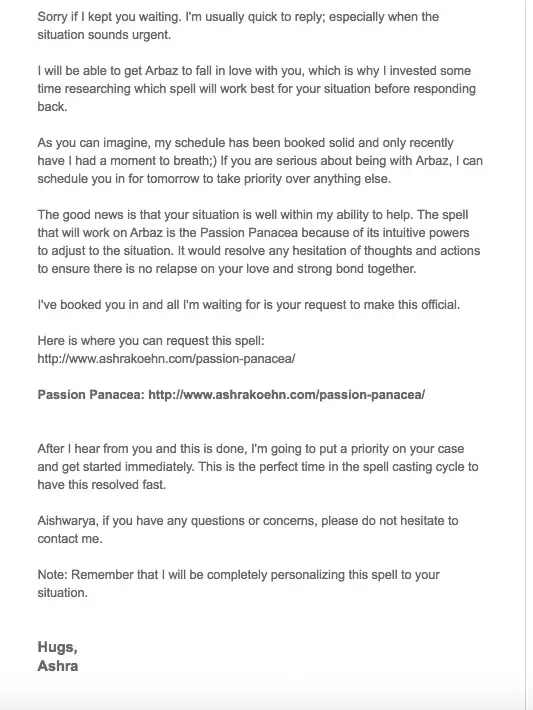 When you write to her and she responds, she sends the same generic template email "are you okay" subject heading and recommends: passion panacea", you feel good, you feel "well I guess I will try it" she will then say 2-3 days later "your spell has been cast" with your lovers name added. No matter who you are, you will get the same email template. After a week, she will suggest another spell, you think "well, if it will bring us closer together, why not"