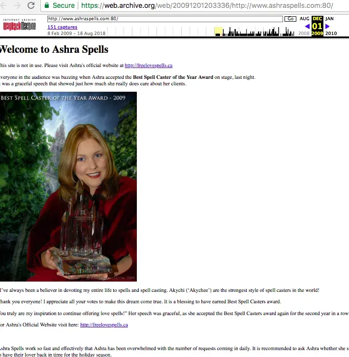 In 2008 and 2009 she left a note on her site stating that she was voted best spell caster by the "Certified Spell Casters Association" you can google this yourself if you use archive.org and go back to September 2012