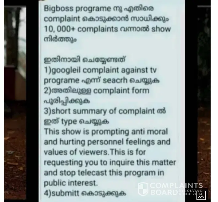 Please take action against bigboss malayalam 4 and Asianet to stop show immediately.