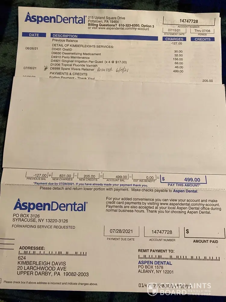 I was invited to apply for a credit card to help me with my dental bill (so I could afford it). I was told I would receive deferred payments for 12 months (?). I agreed to let the office assistance complete the application for me. I did not receive the card with the deferred payment, but I did receive a retail credit card from Fortiva. At this time I am being told that I can not use this credit card to pay the outstanding bill I have with Aspendental. My account number for Aspendental [protected], I have an outstanding balance of $499.00. This outstanding bill is from receiving a retainer. I received the retainer on 6/14/21. I was called to pick up the retainer, I informed the office I would be there on 6/14/21. I had an appointment on 6/26/21. After seeing the dentist I paid my bill (with Fortiva retail credit card). the balance was only for $209.00 it did not include the $499.00. The young lady that charged my card told me she could not get the bill generated for the $499.00. She would send me the bill later; I said alright not knowing if I was not charged at that time I would not be able to use the Fortiva retail credit card. My resolution I am able to use the Fortiva retail credit card for this bill. I have spoken to the corporate office at [protected]. I was informed that there would be an attempt to contact the second office manager not Alissa Kriczky (she informed me that I could not use the Fortiva retail credit card).