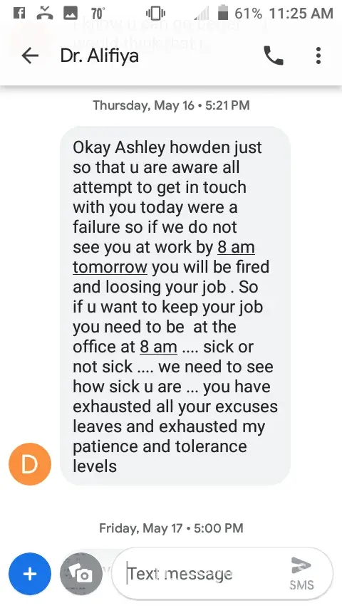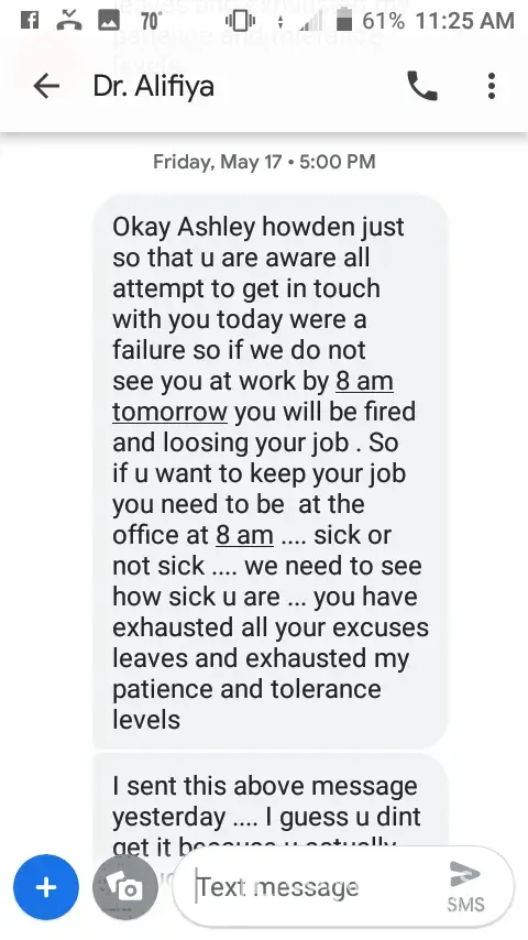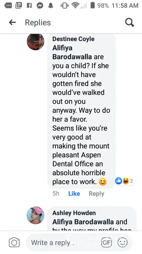 I was an employee of Aspen Dental from July 2013 to May 2019. I have dealt with a lot of stress and discouragement from the Mt Pleasant office. In May I was undergoing some personal health conditions that made me unable to go to work to lead to termination from Dr. Barodawalla. I have nothing but negative feedback from the dentist. I received text messages that were rude, discouraging, and uncalled for. Which I have pictures of them all from text messages. Here recently the dentist had crossed the line and posted personal information of mine on my Facebook page. Down talking me and making me feel less of a person which I took screenshots of before she had removed her comments but with Facebook being the number one social media sight everyone had seen what she had posted. I am hurt. The names she has called me has lead me to believe that I will never be a good enough dental assistant again. I haven't been there since May of this year and I am still receiving negative comments from her that I don't appreciate. To top it off I really do not appreciate being accused of using marijuana and her saying that I lied about how far along I was pregnant. This office was horrible to work for and now I see why the office could never be consistent with having employees. I honestly don't know how I made it as long as I did.