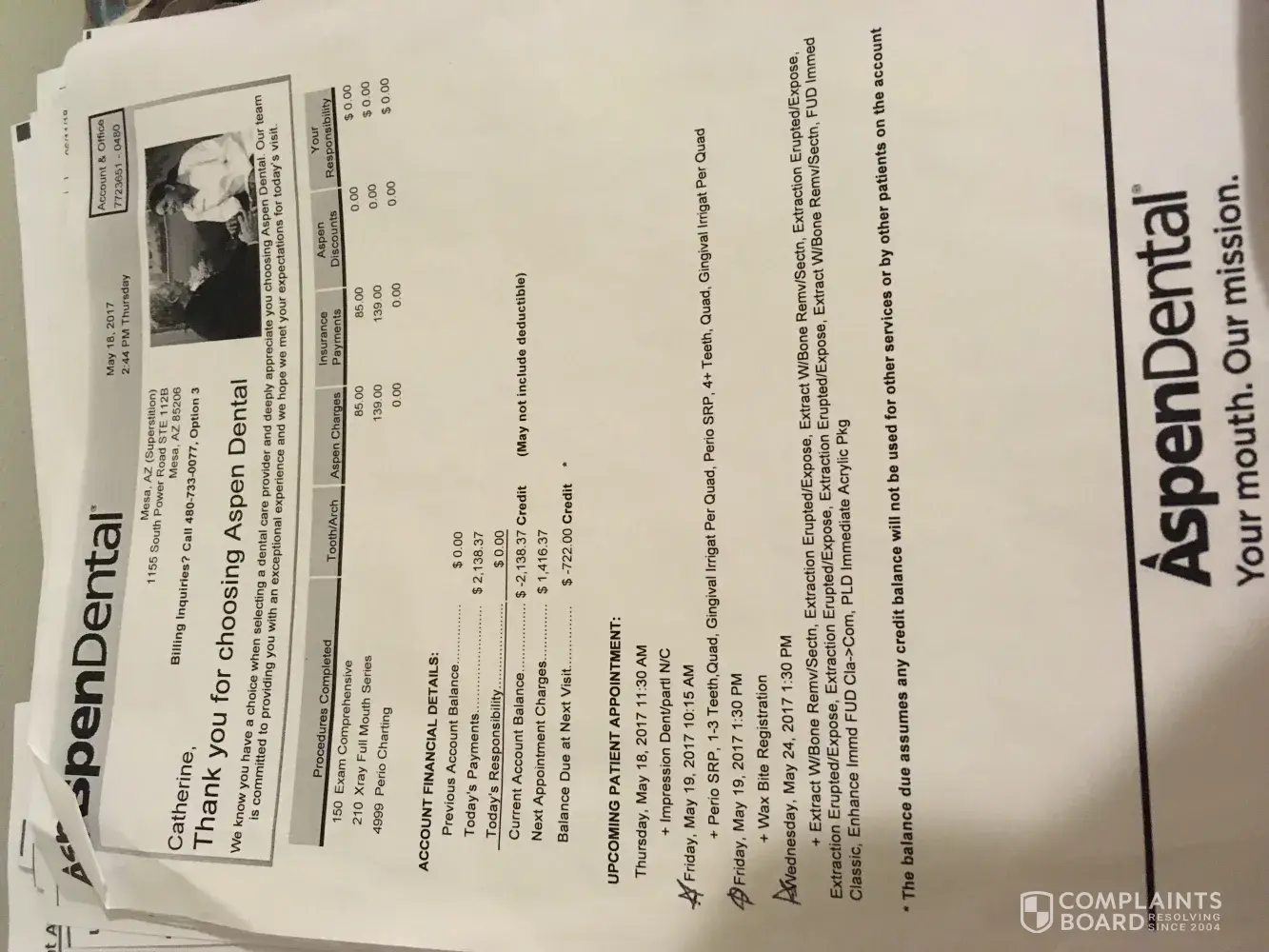 we just drove 45 miles back from aspen dental in joliet, ill. They told us they can not service us because the insurance 10 months ago did not pay the extraction of my teeth.$1000.00 we paid $4700.00 in full back in dec. 2017. this was a 7 year warranty of satisfaction not. we made too many trips for adjustments we need a lawyer. [protected]@yahoo.com
