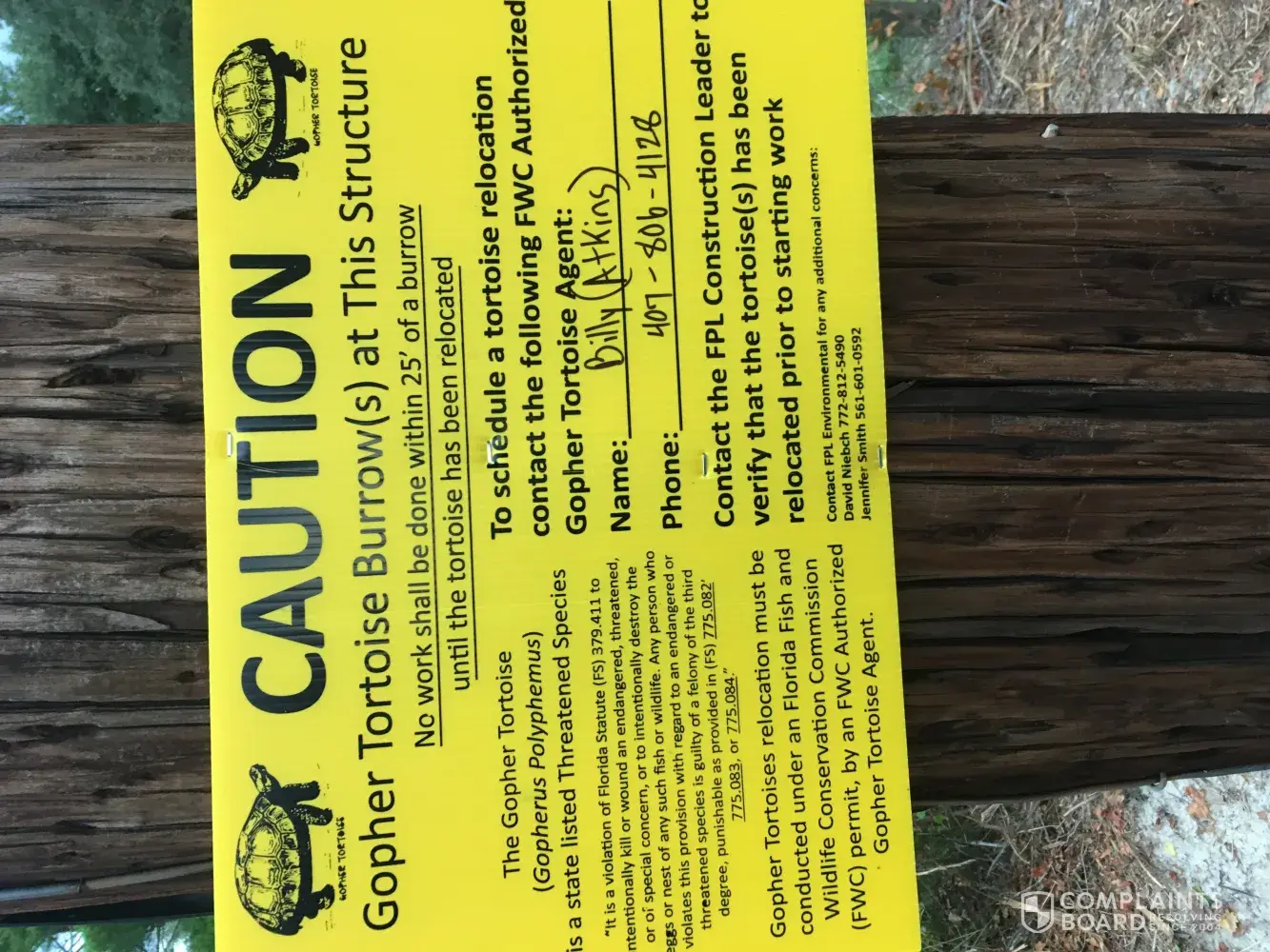 On July 19, 2019 a crew from a Asplundh showed up in my backyard on the right of way without telling me they were coming. My wife was awakened by the sound of chainsaws in the backyard.in my opinion these guys way overcut the trees in my backyard. My backyard is only 200 feet long and they were there for eight hours cutting trees. I think it was a crew of five. While there they left the yard a mess, they caved in a gopher tortoise hole that had been marked, they damaged my fence on both ends of the yard, they cut trees on my property not on right away, They took apart my log splitting machine and knocked it off its base, Took a nap on our picnic table sat in our backyard furniture, left food garbage and cups in the backyard, played with my golf club and golf balls and hung wet T-shirts on my fence to dry. I sent some pictures but I have many more.