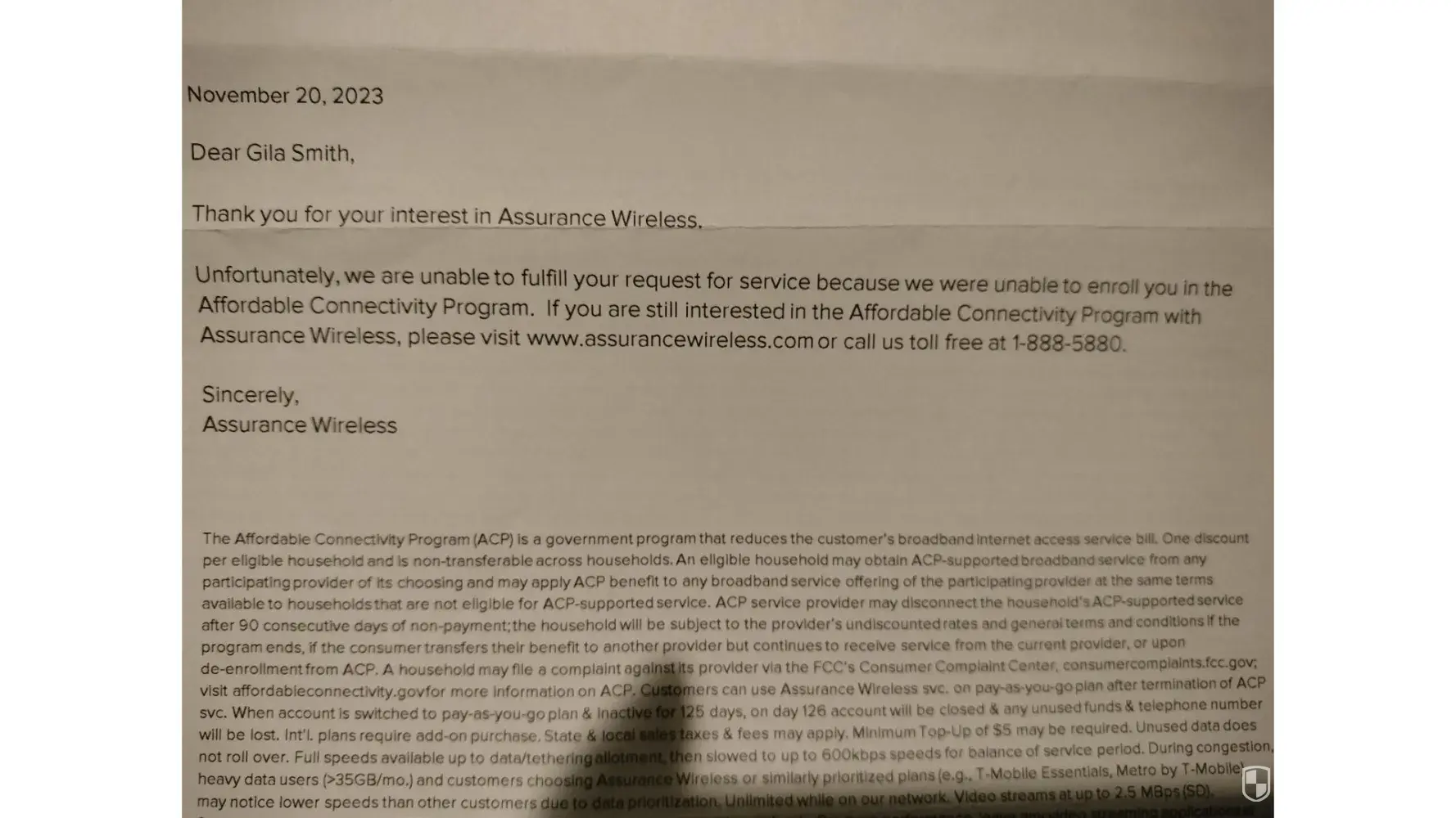 4. While waiting on a working replacement, I received 2 letters from Assurance. One stated that if the phone is not used by Dec. 5, 2023, service would end. How can I use a phone I do not have? The next letter on Nov. 20, 2023 stated that unfortunately, they were unable to fulfill my request for service because they were unable to enroll me in the Affordable Connectivity Program. If I was still interested in the Program, I would have to call the number or go online to their website.