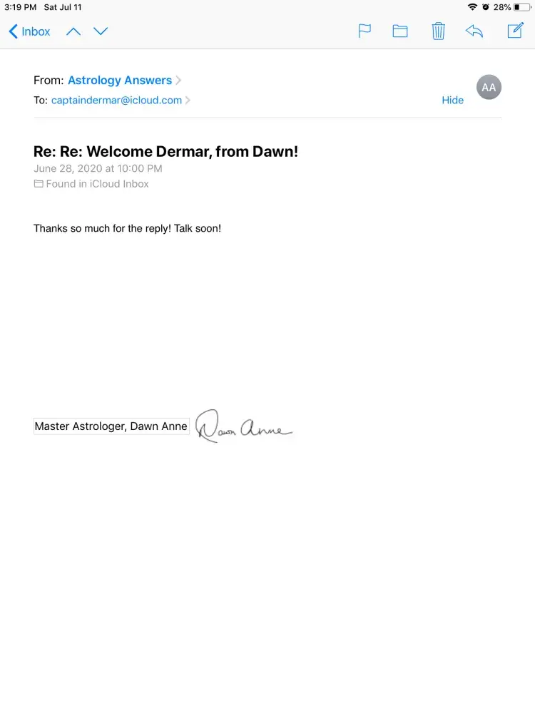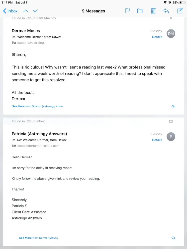During the first week of July I was gifted several exclusive readings by The Cosmos. I enter my email, I submit the information and A response from Astrology Answer says its providing me a detailed reading that is going to TRANSFORM my life. I received multiple readings so I purposely enter more than one email as I knew it would be a sequence of when I would obtain my readings. Dawn emails me at my preferred email, confirms it's me and "States" she will send me my crucial reading to help with my transit period at that email I answered. Great! Next day...NO MESSAGE FROM Dawn or ASTROLOGY ANSWERS about my full reading.. I email support, I emailed Dawn, and I called the representatives. I either spoke to somebody who was extremely rude and unprofessional or I people told me that they couldn't help. They stated I had to buy a package psychic reading If I want help. They kept telling me, "I don't have an account". Wow, so deceitful! What's interesting is that they oddly began emailing my other accounts although I was emailing them from my preferred! Why would they do that if Dawn verified the email account I already stated and they knew this was precision TIMING for me to receive my psychic reading ? I guess you can't TRUST HER OR THIS COMPANY to be legit! After several complaints to their online Customer support they email me a week later saying sorry. THEY ARE NOT CREDIBLE, ACCOUNTABLE, GOOD ON TIMING OR ORGANIZED.