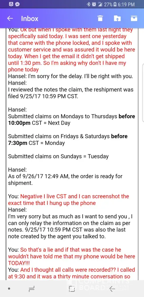 I submitted my claim on Friday 9/22/17.. I paid a $200 deductible for a galaxy 6 edge, now they send me my phone Monday 9/25/17 and its a refurbished phone and the screen is locked with a code so I can't unlock or activate. So I call customer service and after talking to them for 30mins they tell me it's nothing they could do so they'll send me out another phone. So the customer rep tells me that my phone would be here today and i specifically asked was it going to be here today and he assured it. So I receive an Email saying that it was set up for shipment at 1:30 pm today so its no way it'll come today. So I first Chat with the help and she tells me I didn't put the claim in until after the deadline. Now I live in CST and as you can see on there web site it says before 10:59 pm. I have the confirmation email he sent me right after we talked at 10pm. So I call and speak to a rep and he tells me that the deadline was 9:59pm not 10:59 cst like the web site and as you'll see attached the chat help stated. So now I have to tell my child once again he has no phone because a company I've been paying and never used until now can't service there customers correctly.