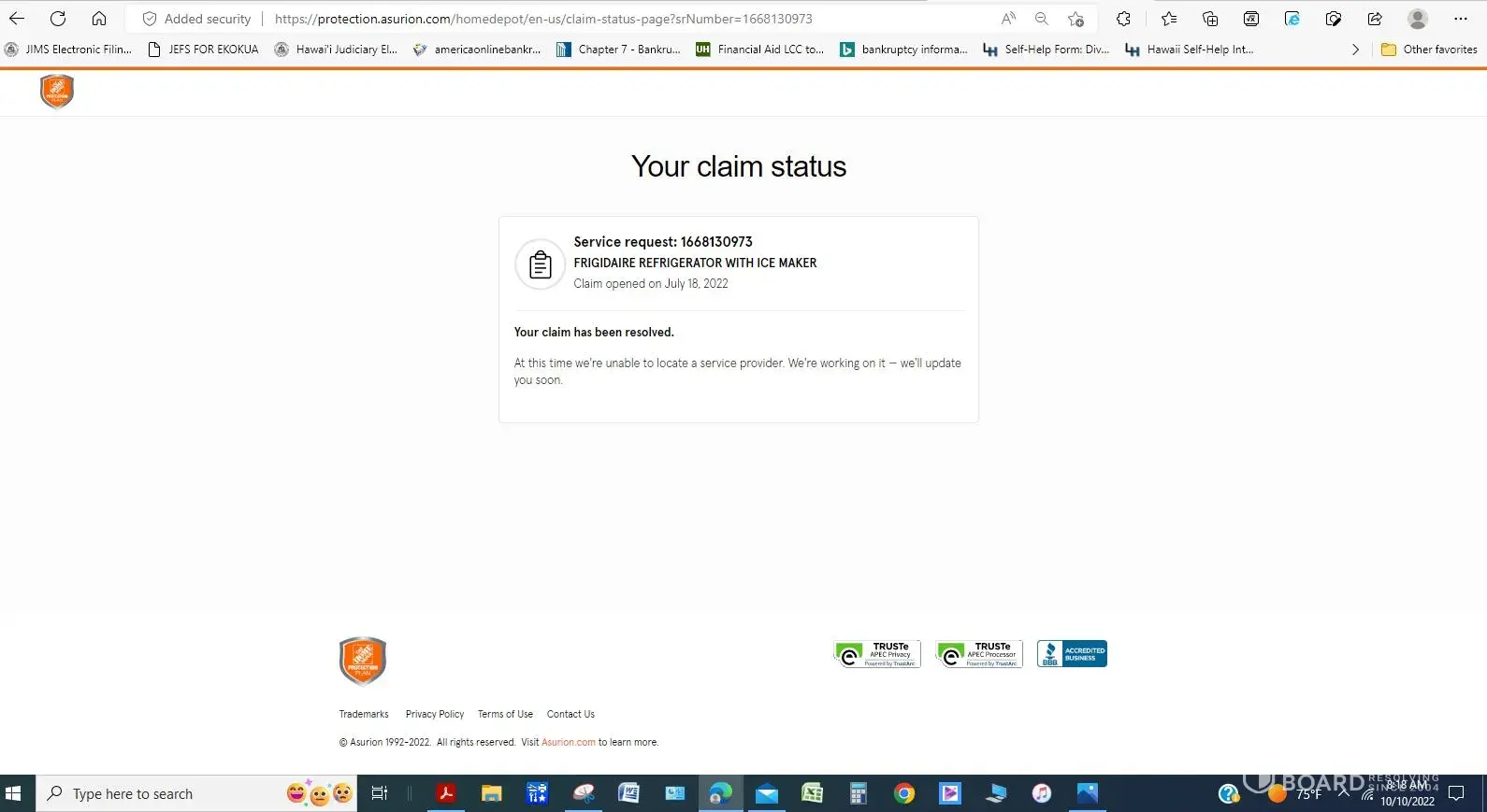 I am contacting you today because I filed a claim with Asurion on behalf of my elderly father on July 18, 2022, to have his fridge repaired through the Asurion protection plan that was purchased along with his new fridge on October 6, 2017. The fridge is not getting cold, and the digital display is not working. To date the claim has not been resolved and Asurion will not get back to us on the status of the claim!