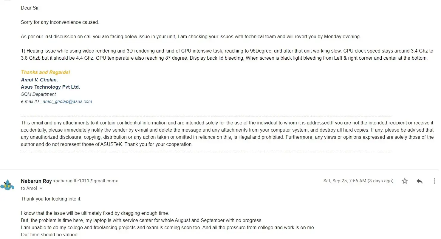 -Screenshot 2 and Screenshot 3 : How asus technicians didn't even acknowledge CPU clock speed issue and GPU temp issue. This was the 4th time. The other 3 times asus did the diagnosis in service center and said the same on call without repairing my laptop. The official technicians didnt even asked me before declaring the laptop has no fault.