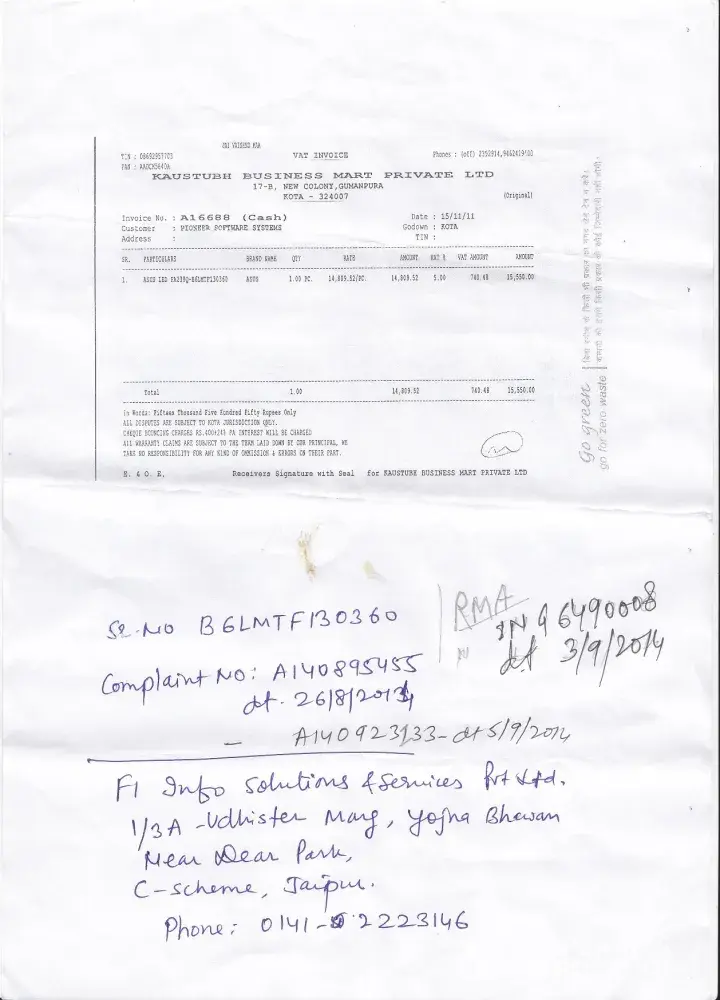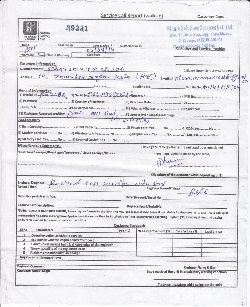 A call came from asus india telling me to take the monitor to f1 info solutions and service, 1/3a yudhister marg, opposite yojna bhawan, jaipur for repair there is no service center in kota. on 03/09/2014 I took the monitor to the said address in jaipur and handed over the lcd monitor along with the original box packing to mr. rajesh at the service center. he checked the unit for roughly 45 minutes and told me that the switch and master card of the monitor is not working and they need to be changed. he told me to contact him after one week time. he than gave me the service call report stating my personal details and the details of the monitor (mode, serial no., problem type etc). rma no. is ing649008 dt 03/09/2014