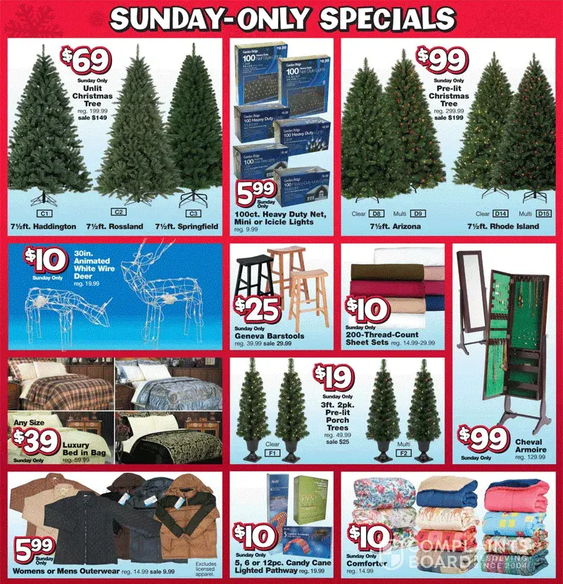 Garden ridge posted their weekley ad and I very excited to see "sunday only $99 for a 7 1/2 foot prelit tree-style arizona or rhode island normally $299!" I gave my christmas tree to my son and arrived at the store 8 a.M. Sunday morning to get that tree! I was one of the first into the store and they did not have those trees in stock! I could have understood if I had waited until late sunday morning but I was the first over there and the ad trees were not there. I spoke with a manager and she stated that the sunday ad was a misprint, only 9 1/2 ft trees were on sale for $199 and the corporate office became aware of the mistake wednesday before the sale. That tree is too tall for my house and $100 over the ad price! She was very nice and tried to show me some $99 trees but I was not happy. She explained as per company policy she could not substitute a similar tree or reduce prices on any other tree. I then asked if I could get one of the trees from the thursday only ad for the thursday price because there were plenty in stock. That was also a no. Company policy allows the managers to offer no discounts or price changes. The manager tried to help with in the limits the company gave her but all she could give me was an email address to contact corporate. As one of the clerks said, "don't bother, they won't do anything to correct their mistake." so why are we giving our hard earned money to a company that uses trickery and deceit to get us in the store and does not honor its ads? Why are we helping a company make money when they care so little for its consumers that they do not even give the managers discrectionary overrides? Where is the customer service? Consumers are not always right but if you want to keep them happy and spending money at your store, then empower your managers to fix your ad mistakes or quit making mistakes!