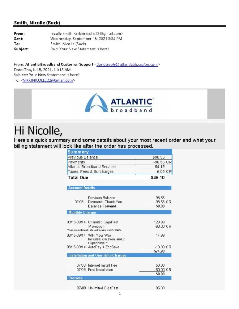 On August 04, 2022, a credit of $98.53 posted to our checking account from Atlantic Broadband Cable. In total,