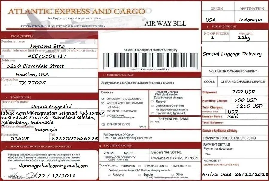 Honey...here is all the list and the airway bill of your gift, the company will make delivery to your address give me because i gave them your contact information and how to make delivery to you...so the company say you will pay the little local charges in your country like 450dollar or 500dollar that what them told me but them didn't told me how much you will pay that's why i put 8, 000britishpounds inside the package...make sure that you make the payment and let the company deliver your gift to you Immediate.remember the gift is too expensive i spend alot money for that gift plus money i put inside the package