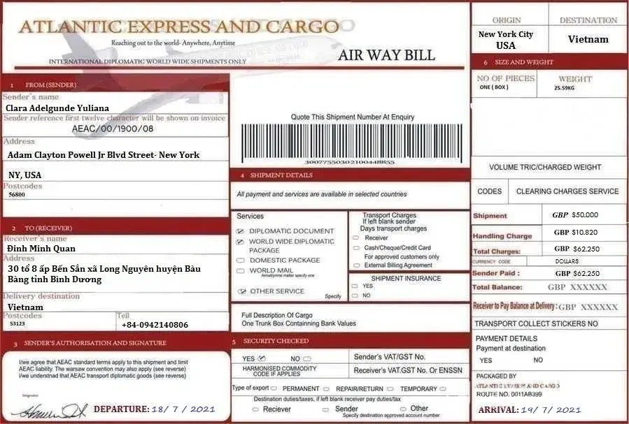 I just want to know, from Atlantic Express & Cargo why they are letting these people use their Company name, they should find out about these people and put them behind bars. It's gonna effect their services to all over the world. And the other thing is no one will trust them. Some body has to do something about it. Because I just have a box deliver too. But I have to pay $2, 100US I can't believe it, cause if I send a package I paid for everything so the receiver just pick it up when it's arrive or they just deliver it to the address on the package..