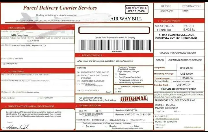 I got a parcel from MR DEMSY GARRY of Scotland. I attached here the BILL RECEIPT.