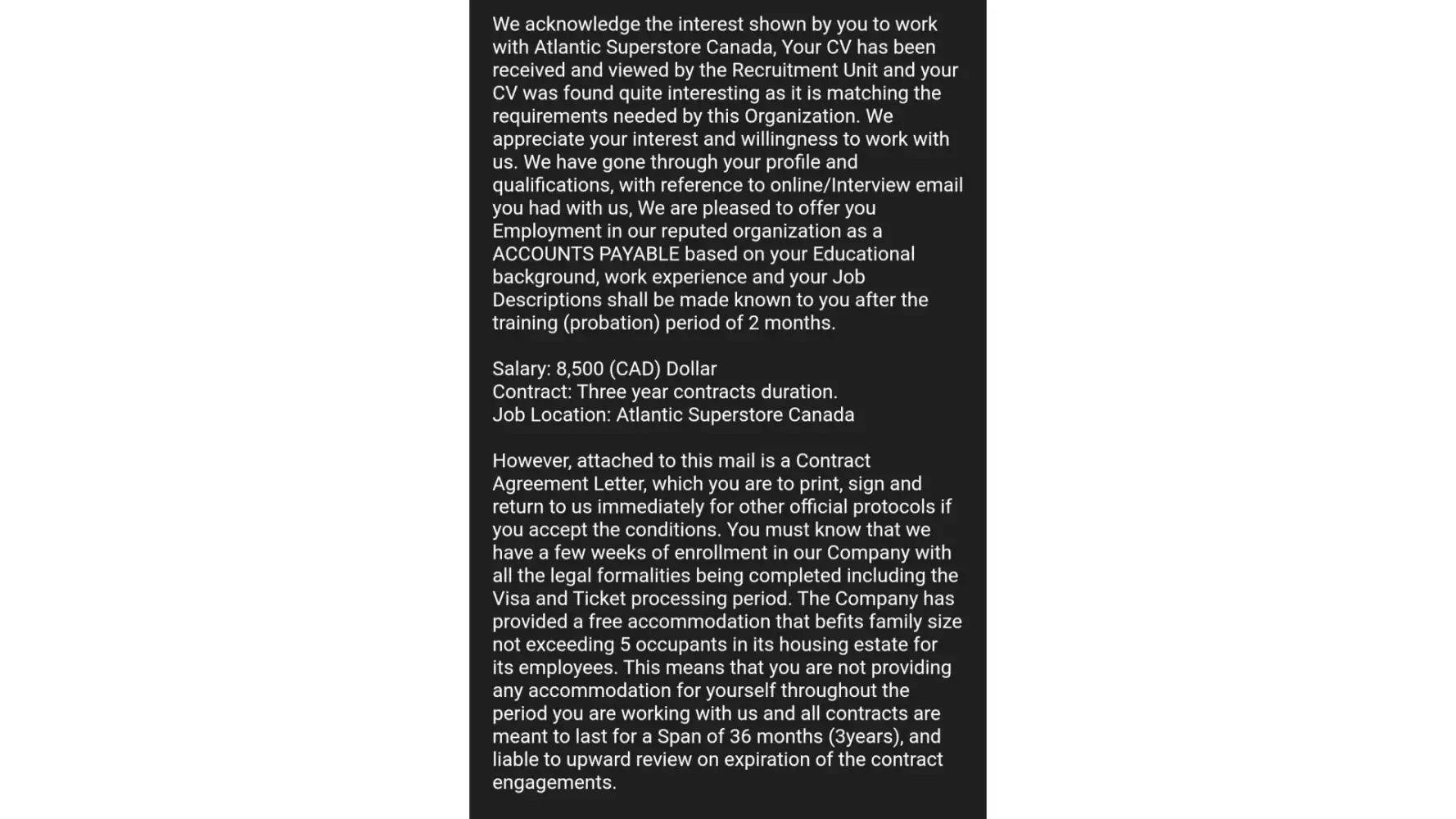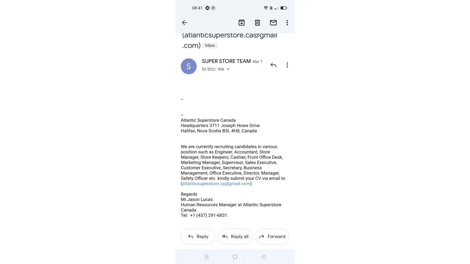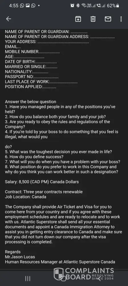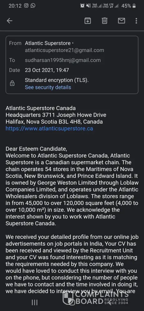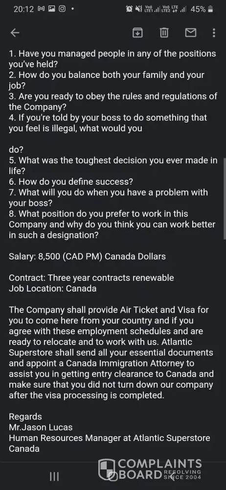 I got a mail from a mail id ([protected]@gmail.com) mentioned that atlantic superstore is recruiting candidates and paying 8500 CAD per month on 3 years contract basis for abroad candidates. It was mentioned that mail has sent by Mr. Jason Lucas, Human resources manager.