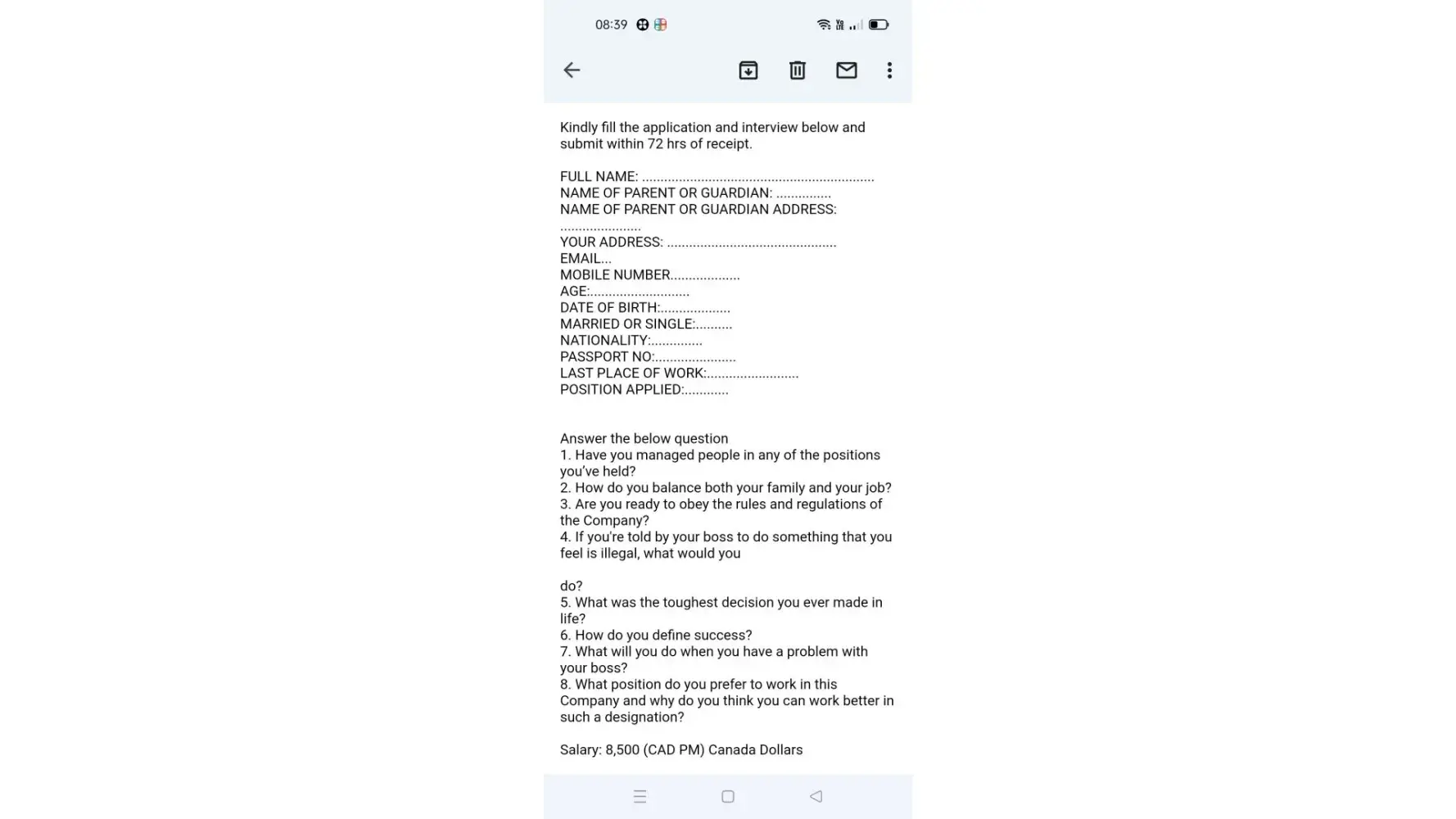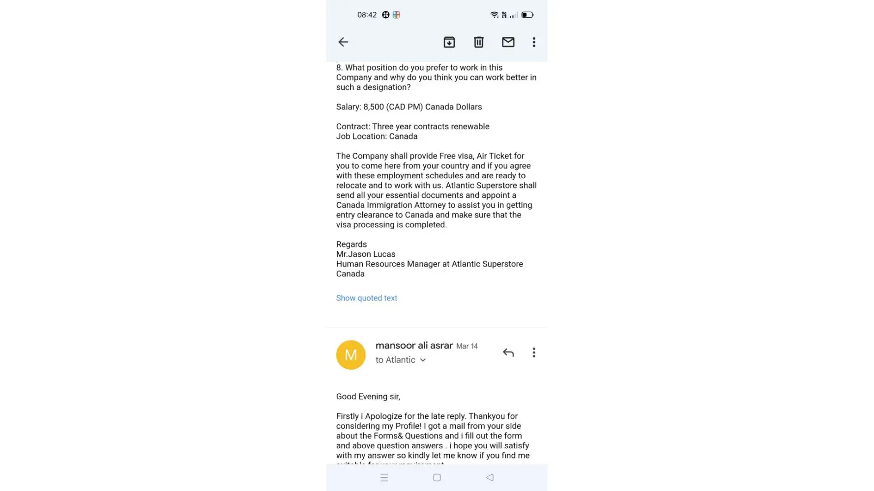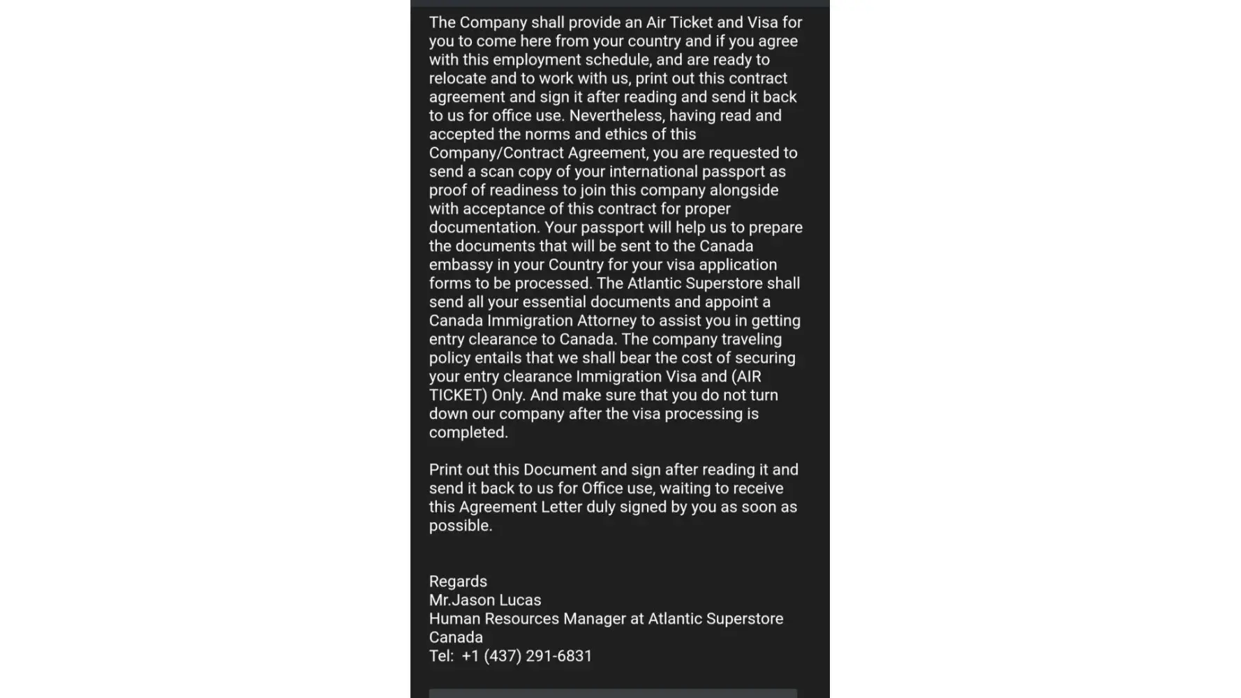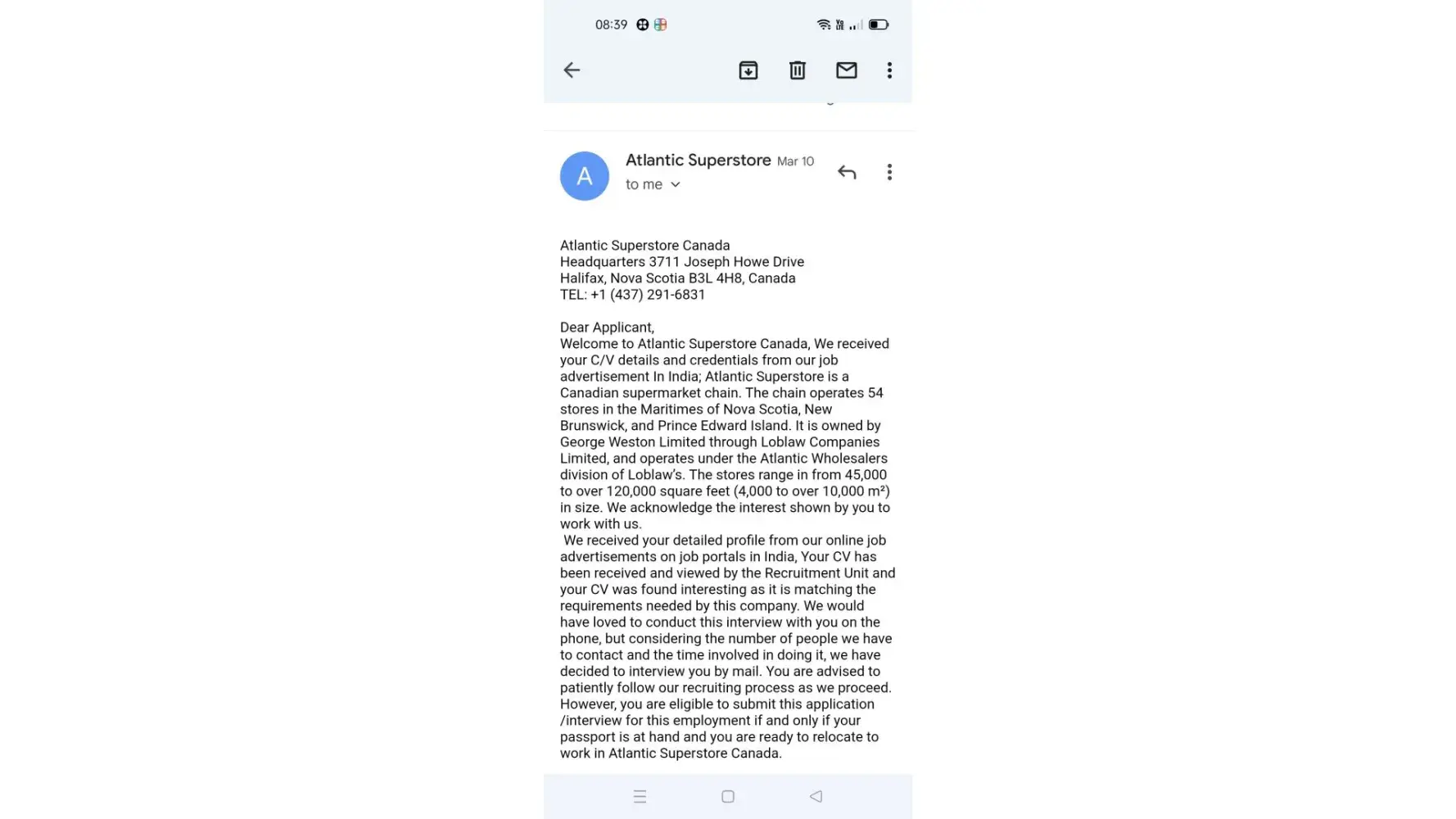 I got a mail from a mail id ([protected]@gmail.com) mentioned that atlantic superstore is recruiting candidates and paying 8500 CAD per month on 3 years contract basis for abroad candidates. It was mentioned that mail has sent by Mr. Jason Lucas, Human resources manager.