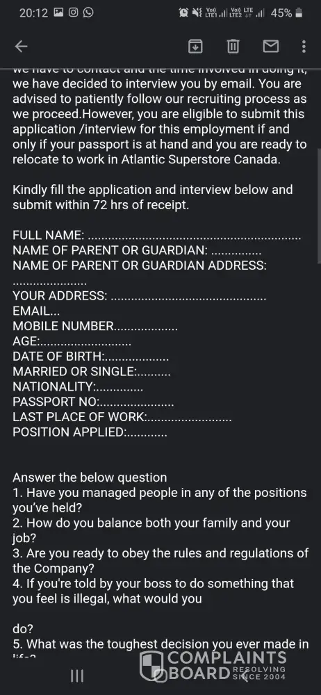 Actually I got a mail from Atlantic super store regarding job offer so I want to verify this info is true or not . Kindly please help me out. Iam sharing a picture below.