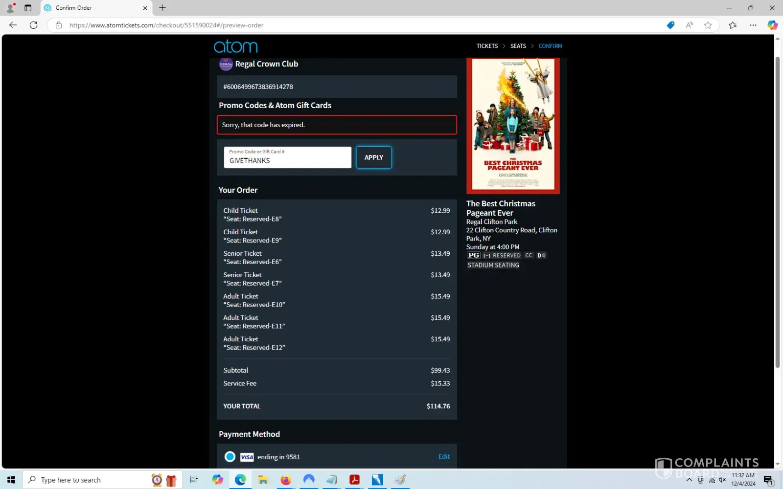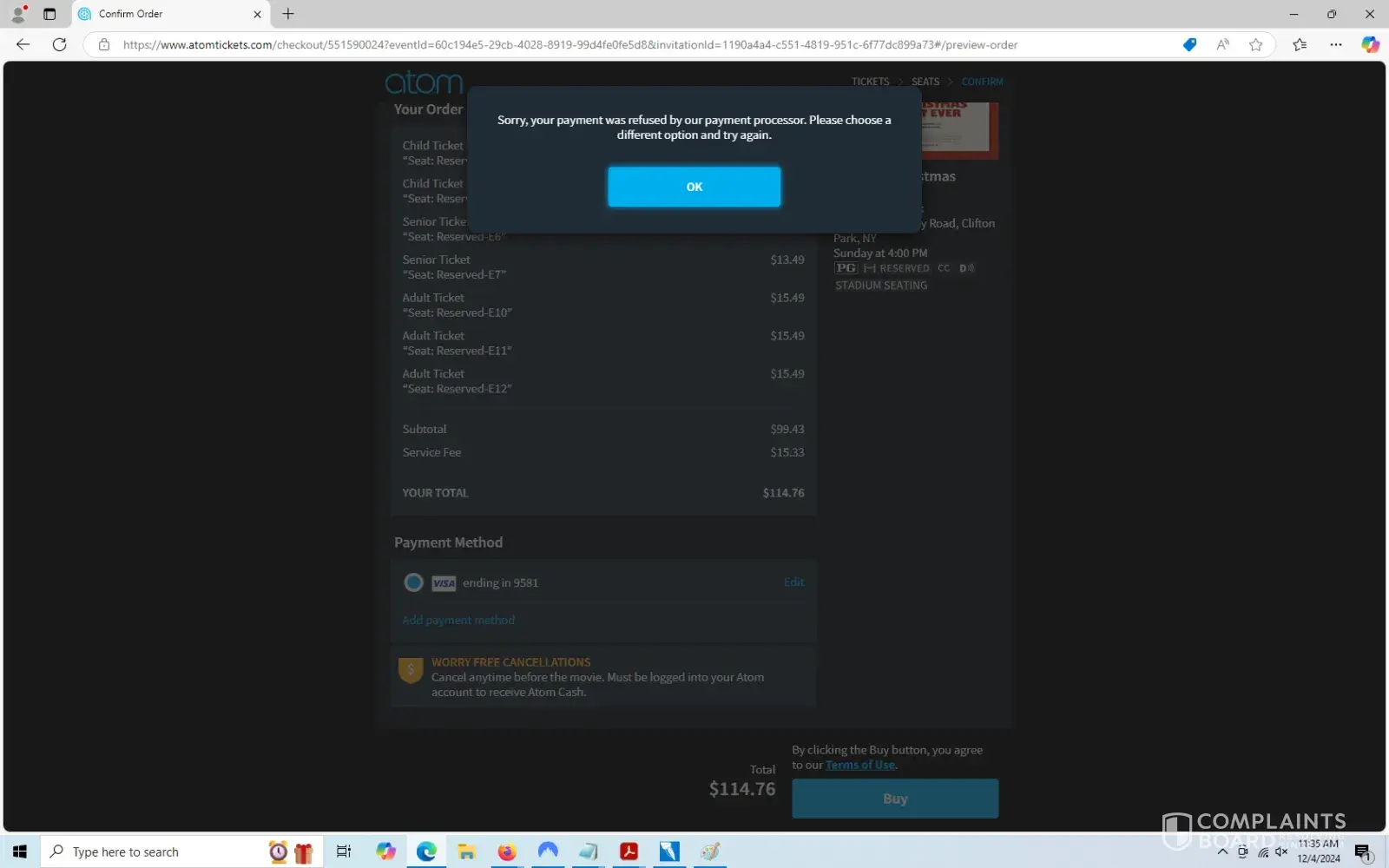 Company won't give a complete refund, even after admitting they didn't give correct instructions for using their service Atom Tickets is nothing but a rip off. I got a code on a DVD from Walmart that was supposed to give me a free ticket through atom. First, I couldn't find any instructions on how to redeem it. When I finally heard back from atom, the instructions were not clear and turned out to be incomplete, leaving out a very important detail that you needed to create an account to get the free ticket. I went ahead and purchased what I thought was a free ticket, only to be charged full price PLUS a "convenience fee". When I copmplained again after sitting on hold with their "customer service" people for over 20 minutes, they wouldn't do anything to help, except to try and get me even more hooked in their useless company by creating an account and getting credit, meaning I'd have to use them again to use it, and I'm giving that loser of a company any more of my money for their inconvenience fee garbage. These guys need to be taught how to do customer service and give a FULL refund, or they need to be put out of business. I should have checked their reviews almost 90% of their customers think they stink and aren't using them again. How this place even stays in business I don't know wait, I do by stealing fees from unsuspecting customers!