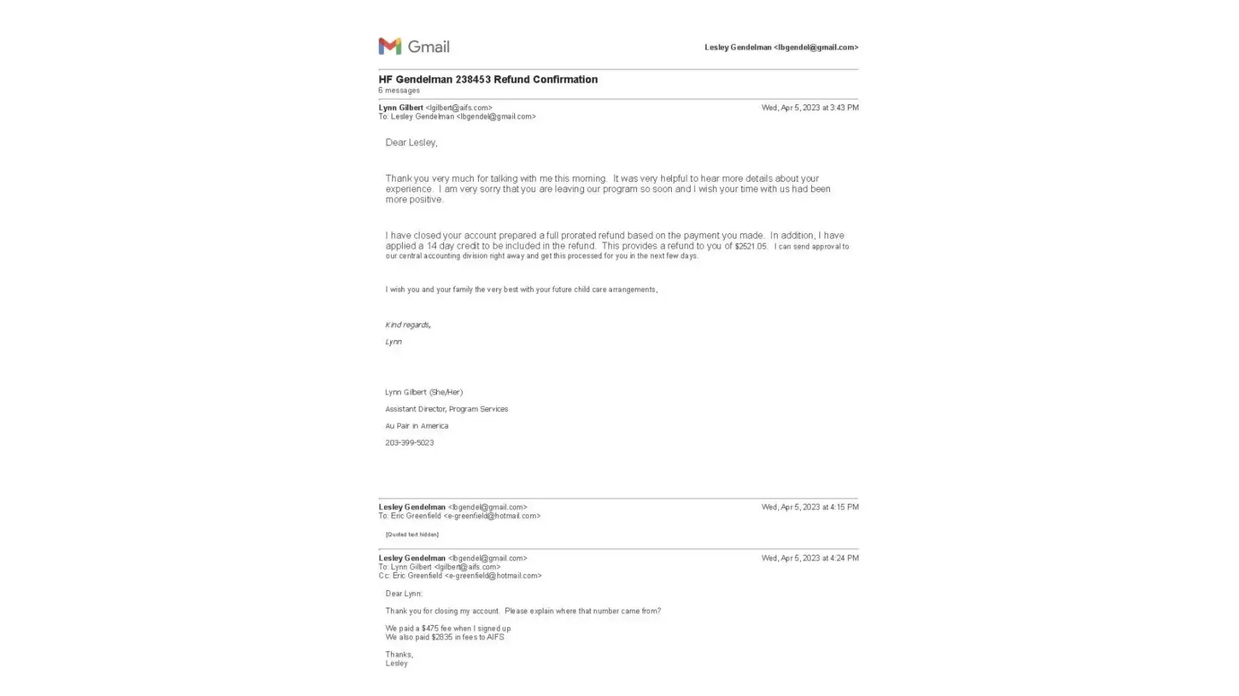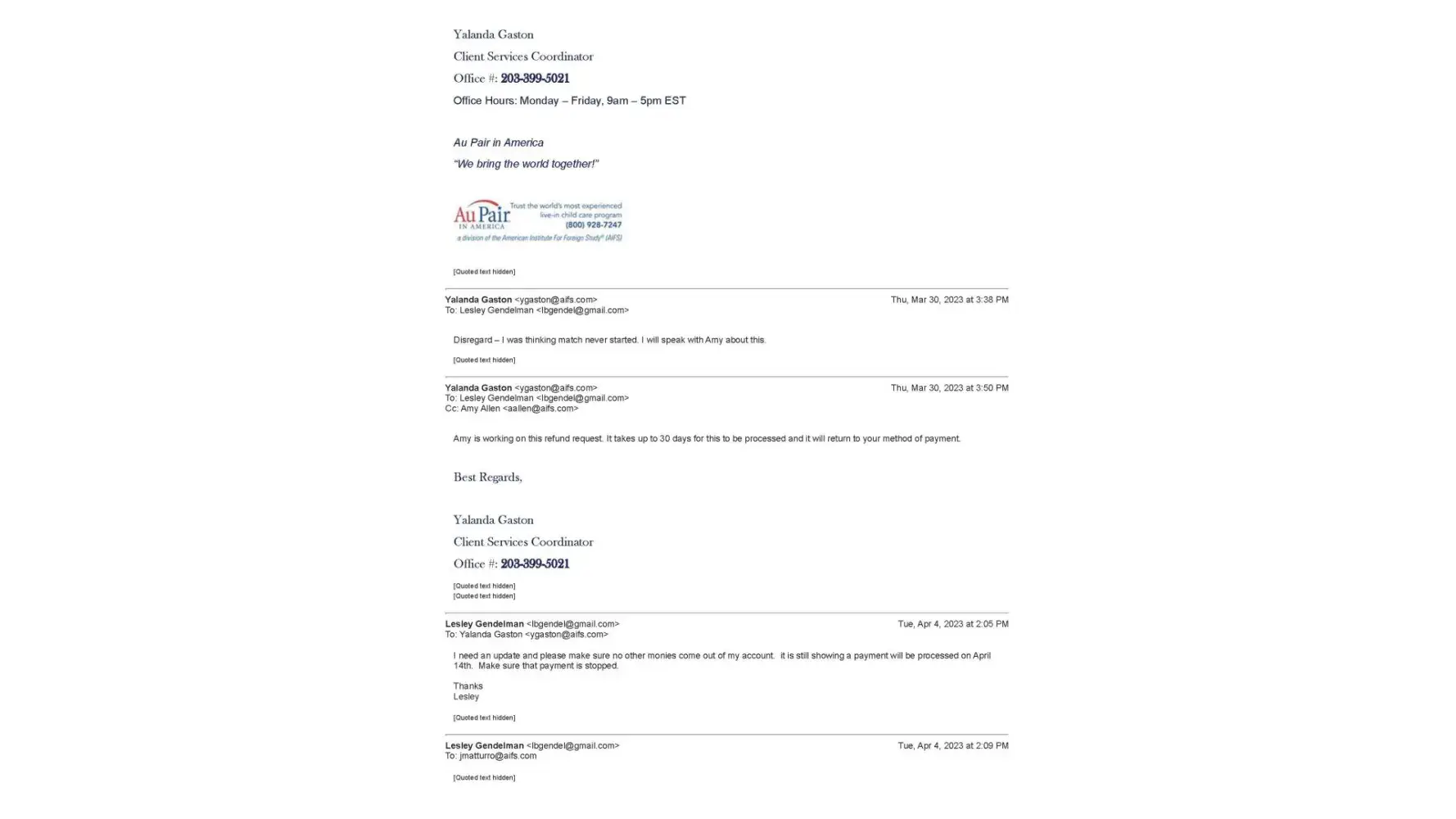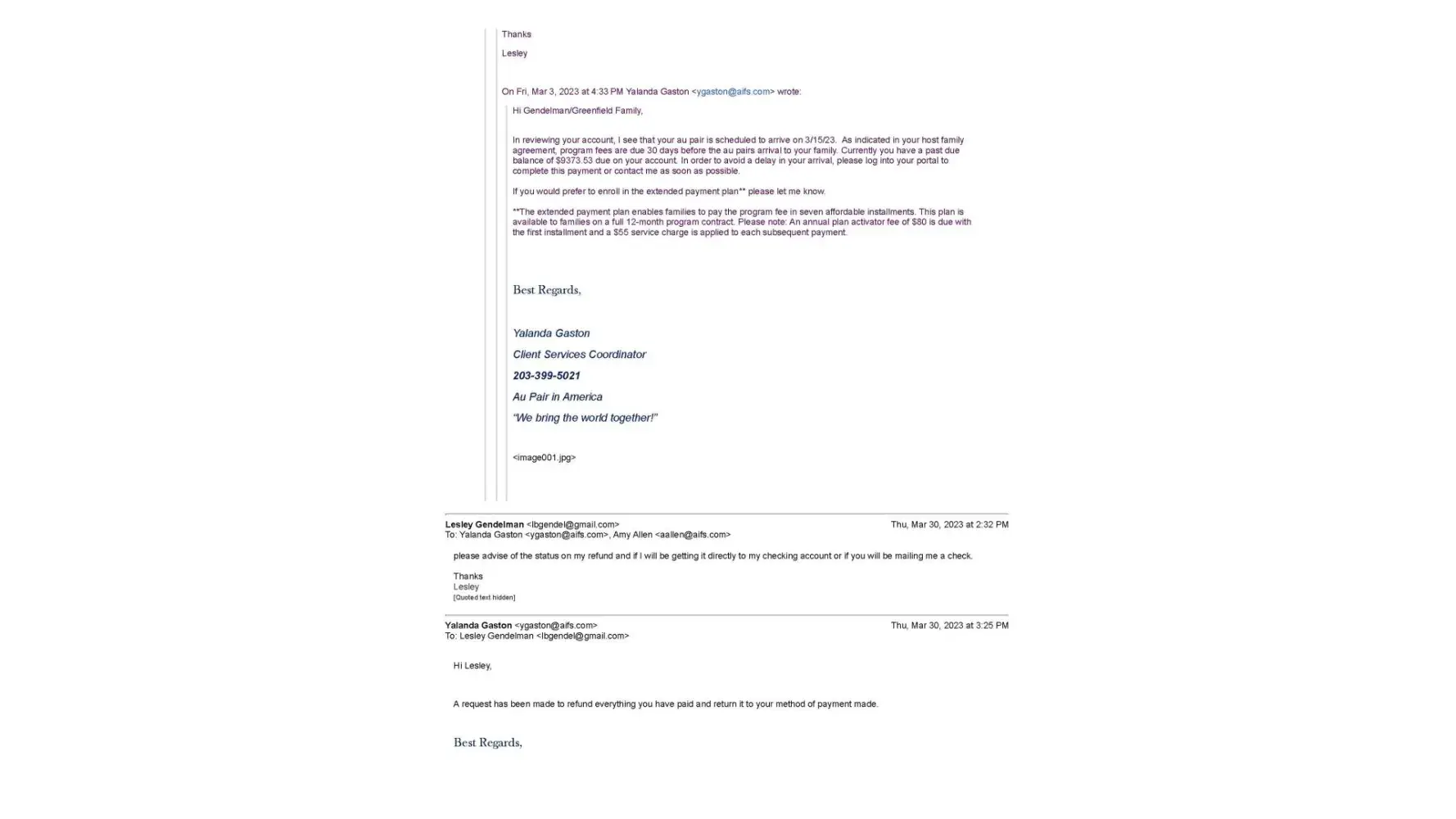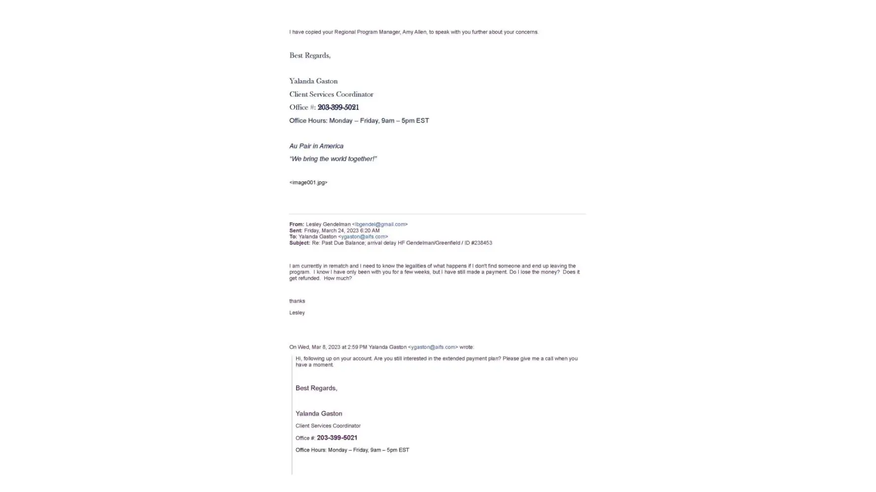 Despite all of this, we could not get a refund for the big upfront fees paid to Au Pair in America. The counselors are shady, blamed us for the entire situation after hearing the au pair's lies without hearing both sides of the story first, and company/representatives stopped responding. What a scam.