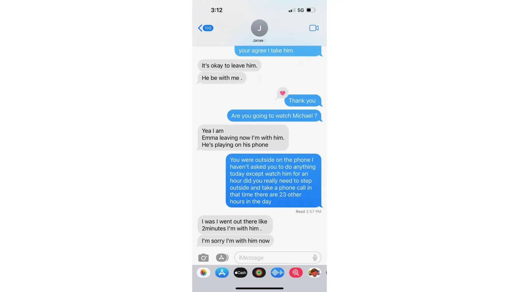 Since she has been here I have asked her to do so little as I had an overlap au pair. However, she is now gone and yesterday I needed help for 1 hour as you can see in the text message and she couldn't even do that. My 14 month old likes to open and close my oven, and put things in his mouth. Do you know how quickly a child can get in trouble? Would you honestly trust your kids with this person? But yet again you are placing her with someone else?