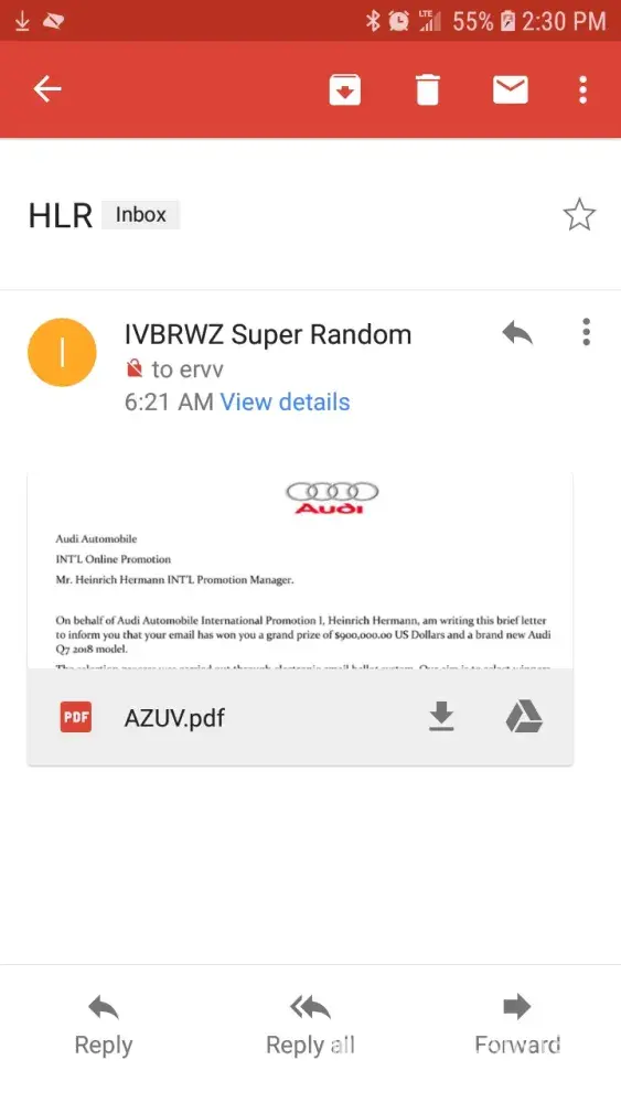 On behalf of Audi Automobile Company, I Mr. Don Morgan is writing this brief letter to inform you that your email has won you a grand prize of $900, 000.00 US Dollars and a brand new Audi Q7 2018 model.