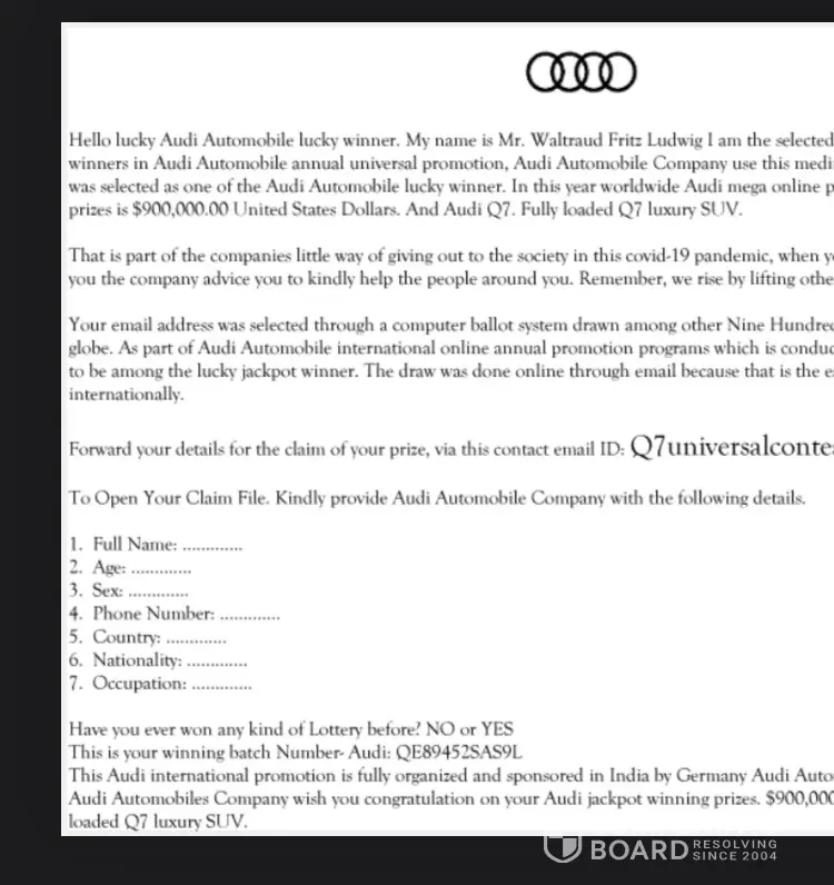I received an email stating that I am the lucky winner of an Audi Q7 and 900, 000. After carefully reviewing the complaints on this website. I have you to know that I'm very disappointed that someone would stoop so low to reach out to all of these people and ask for their important info, but do not deliver what was told they now "own". You never know what blessings people have prayed for( myself included). Apparently, many have complained, but Audi (itself) has not stood against it or tried to recover the scammers. We should all file a lawsuit against Audi and maybe, just maybe they will do something about it.