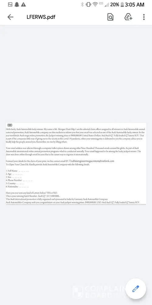 I received a pdf file TOLMVCS from Mr. Morgan Ebert Filip stating that I am a lucky winner for Audi automobile lucky winner. It says my email was selected as one of the audi automobile lucky winner of the year worldwide Audi mega online promotion the jackpot winning prize is 900, 000.00 United States Dollars, and a Audi Q7, fully loaded Q7 luxury SUV.