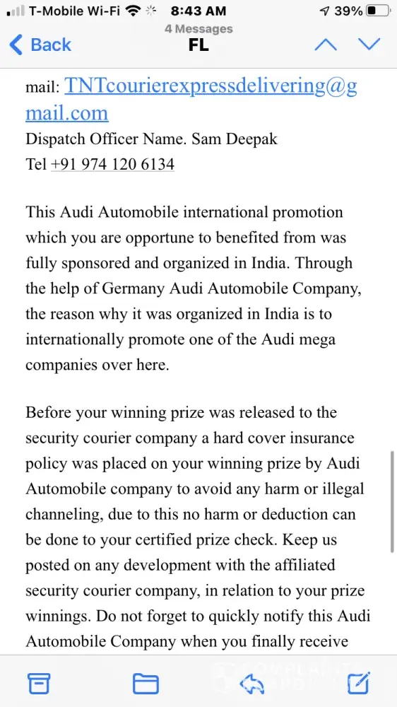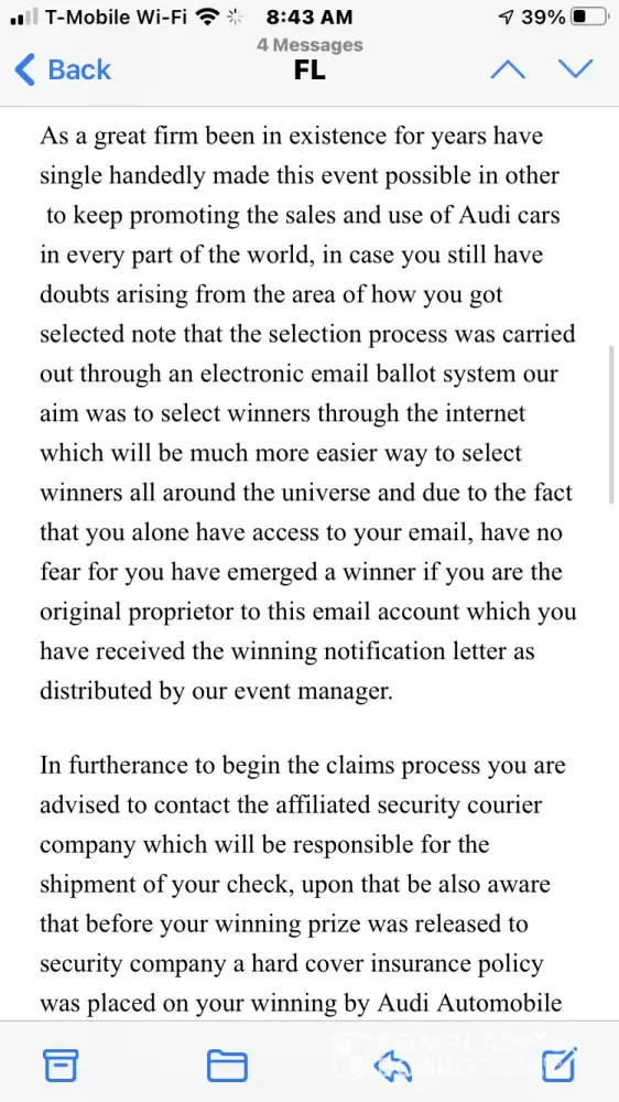 In furtherance to begin the claims process you are advised to contact the affiliated security courier company which will be responsible for the shipment of your check, upon that be also aware that before your winning prize was released to security company a hard cover insurance policy was placed on your winning by Audi Automobile company to avoid any harm or illegal channeling due to this no harm or deduction can be done to your certified prize check.