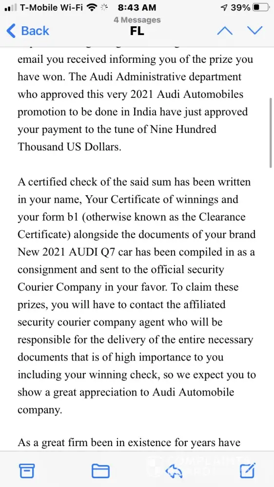 I just received an email about winning $900, 000 with an Audi 7 so they're sending that out again maybe you can write something on your website I received it on March 6 2021