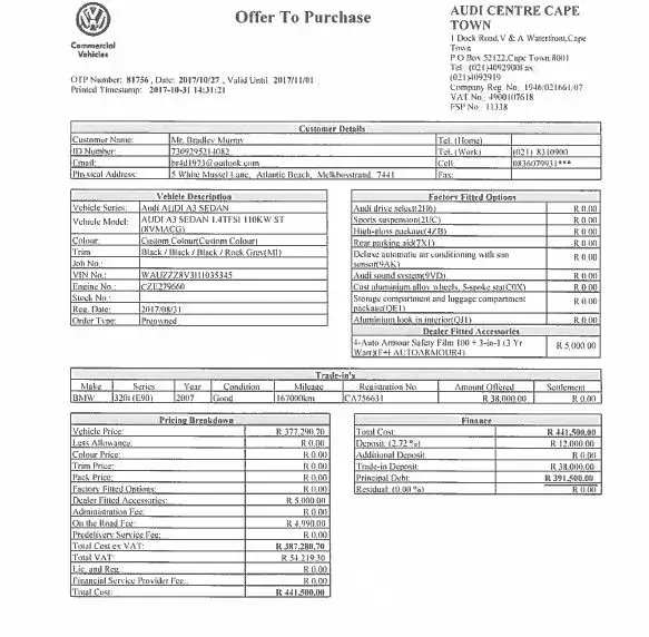 I recently purchased an 2017 Audi A3 Sedan from Audi Waterfront in Cape Town. In my documented conversations with the dealership I expressly confirmed that there was to be no residual on the Finance agreement. Audi came back to me with a finance quote that detailed a monthly premium without a residual balance. I advised Audi that I would like to get a comparative quote from Absa Bank as they are my Bank. When the quotation finally came back the Premium was approximately R 7100-00 Pm. I was told that there was no residual balance on the vehicle and as such was happy to sign the contract. At no point in the contracting process was I shown a residual Value. Had there been a residual balance I would have declined the agreement.