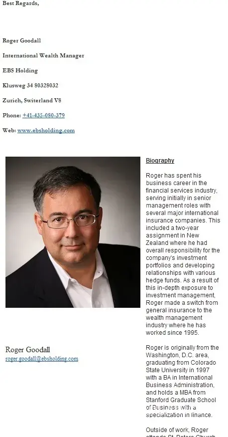 1) From the email signature, it has the URL of EBS Holding www.EBSholding.com, inside their homepage you will found 'EBS Holding was formed in 1993 with the ...' . However, I found this domain was created in June 2014 (via whois ), which means this 'financial service' company doesn't have a website in last decade.