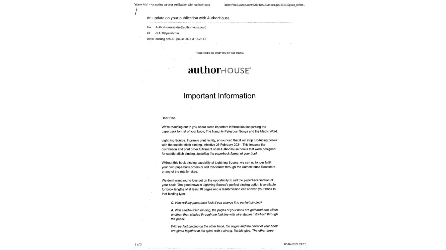 When I asked AuthorHouse whether it was true or not that this particular book, which I thought might be sold out, at one point had been turned into an ebook this was confirmed in an email from an AuthorHouse employee. However, at the same time she told me that my book had been "cancelled", both as a saddle-stick paperback and as an ebook. Presumably the reason for this unforeseen murder of a book I HAD PAID TO GET PUBLISHED was that I didn't reply to an email offer of re-publishing it for £299, but this time as a "perfect binding paperback". Actually, I never received that email and I was not aware that my book had been "cancelled", but I noticed that it had become very difficult to find and buy at e.g. Amazon. No matter what, nothing in my contract with AuthorHouse gives this publishing house the right to kill my book, but everything about this issue speaks "fraud", "crime", and "breach of contract".