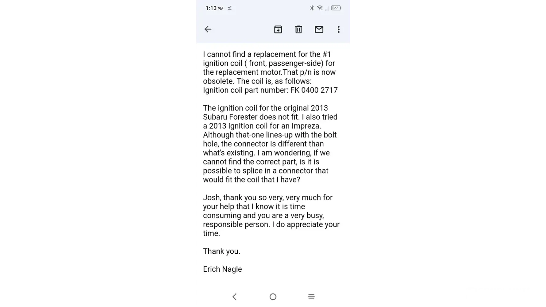 The motor on a 2013 Ford service changed out with something different and the ignition coil ordered for the replacement motor does not fit every rep that I speak to does not understand it is not the same motor and I sent ample identification information but no rep will think and they keep entering 2013 Subaru Forester and... The wrong part... I need somebody that can actually think to research the part number.