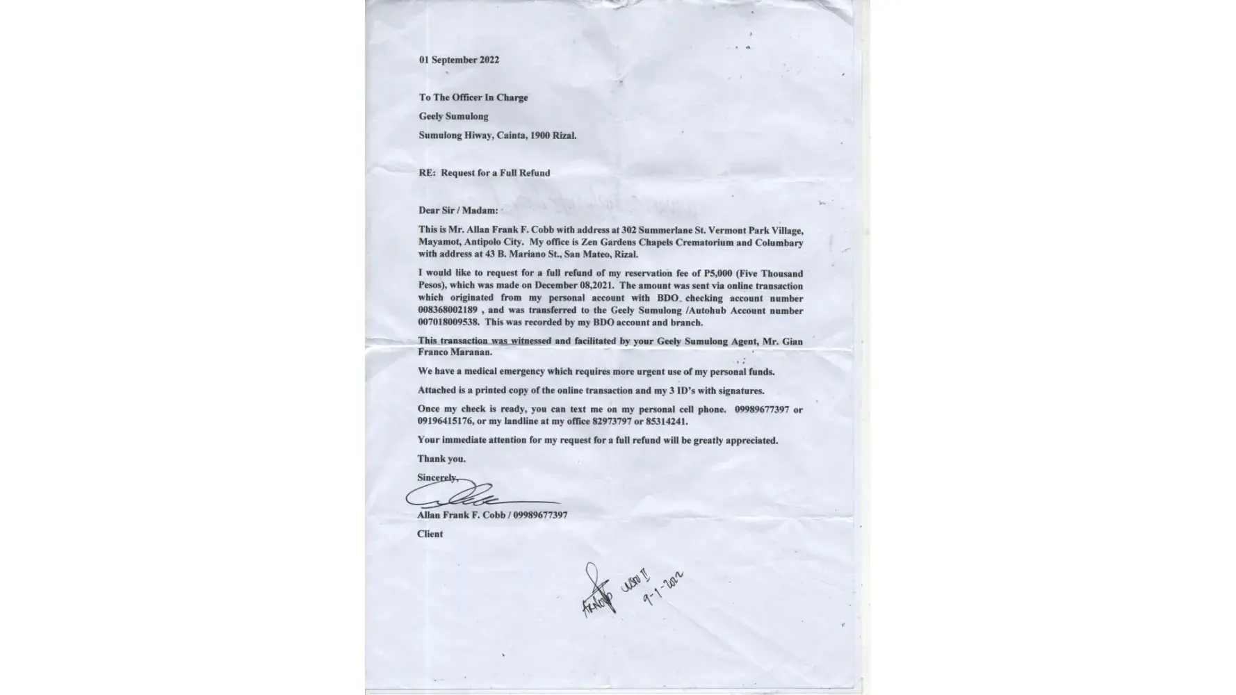 09 November 2022 To The Customer Service Head. THE AUTOHUB GROUP OF COMPANIES RE: Letter of Complaint Dear Sir / Madam: This is Mr. Allan Frank Cobb, I had several Nissan Vehicles, of which I have an old file from Nissan Quezon Avenue. and currently, service from Nissan Sumulong. I made a Reservation Fee to the amount of Five Thousand Pesos (P5,000...