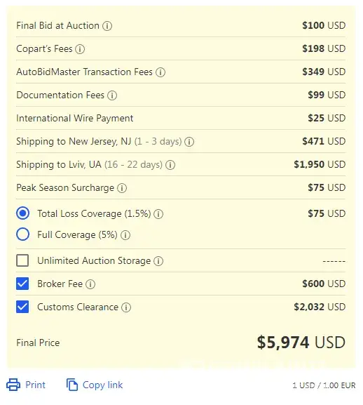 A huge amount of storage fees (a few thousand $) and long waiting for the car title. It's kind of a nightmare when you're waiting a title for 90 days. Very negative experience as the autobidmaster review in general. Customer support is very rude and was screeming on me. My suggestion is to exclude this Copart broker from your list.