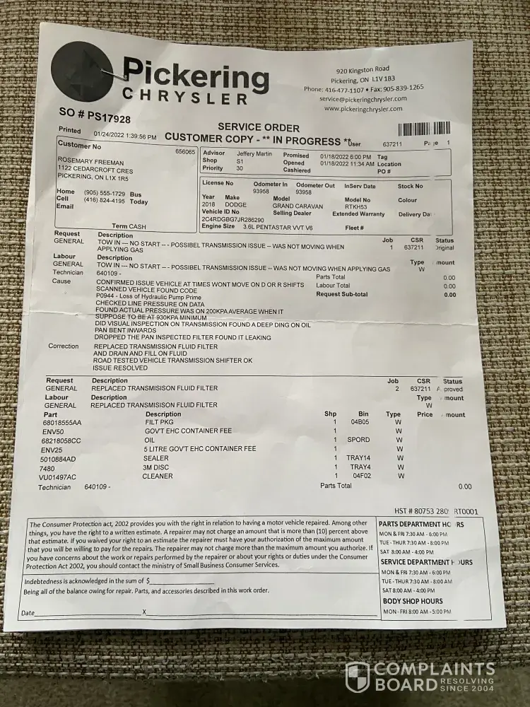 Read full complaintPickering Chrysler - Trans repair and false battery sale